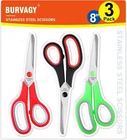 Scissors Set of 3-Pack, 8" All Purpose Comfort-Grip Handles 3pack Product Details Color: 3pack Material: Stainless Steel Brand: BURVAGY Blade Material: Stainless Steel Product Dimensions: 8"L x 3"W Style: Classic Blade Edge: Straight Handle Material: Stainless Steel Hand Orientation: Ambidextrous Unit Count: 3.0 Count Manufacturer: BURVAGY Item Weight: 7.4 ounces Item model number: scissors Batteries Required?: No Color: 3pack Material: Stainless Steel Brand: BURVAGY Blade Material: Stainless Steel Product Dimensions: 8"L x 3"W 8 Inch Scissors:8 Inch Scissors Bulk Set of 3-Pack stainless steel scissors, measures approximately 8 by 3 inches. Black, red and green color are included. Stainless Steel: Each scissor is made from a sturdy, high-density stainless steel blade that is 3 times harder than regular stainless steel, and machined with professional sharpening techniques to provide durable, smooth and precise cutting performance. Comfortable Use:Soft-grip handle for comfortable use, unique ergonomic design, left and right hands can be used. Adjustable brass and stainless steel blade pivots for strength and smooth opening and closing. Straight-handled scissors for smooth, efficient cuts. Suitable for cutting burlap, paper, fabric, tape and more. Multi-purpose Scissors:All purpose scissors, perfect for sewing, cutting, tailoring, quilting, cutting patterns, modification and handicrafts. Suitable for office, school, home and other occasions. Security protection: Please keep the scissors out of the reach of children. Children should be used under adult supervision.