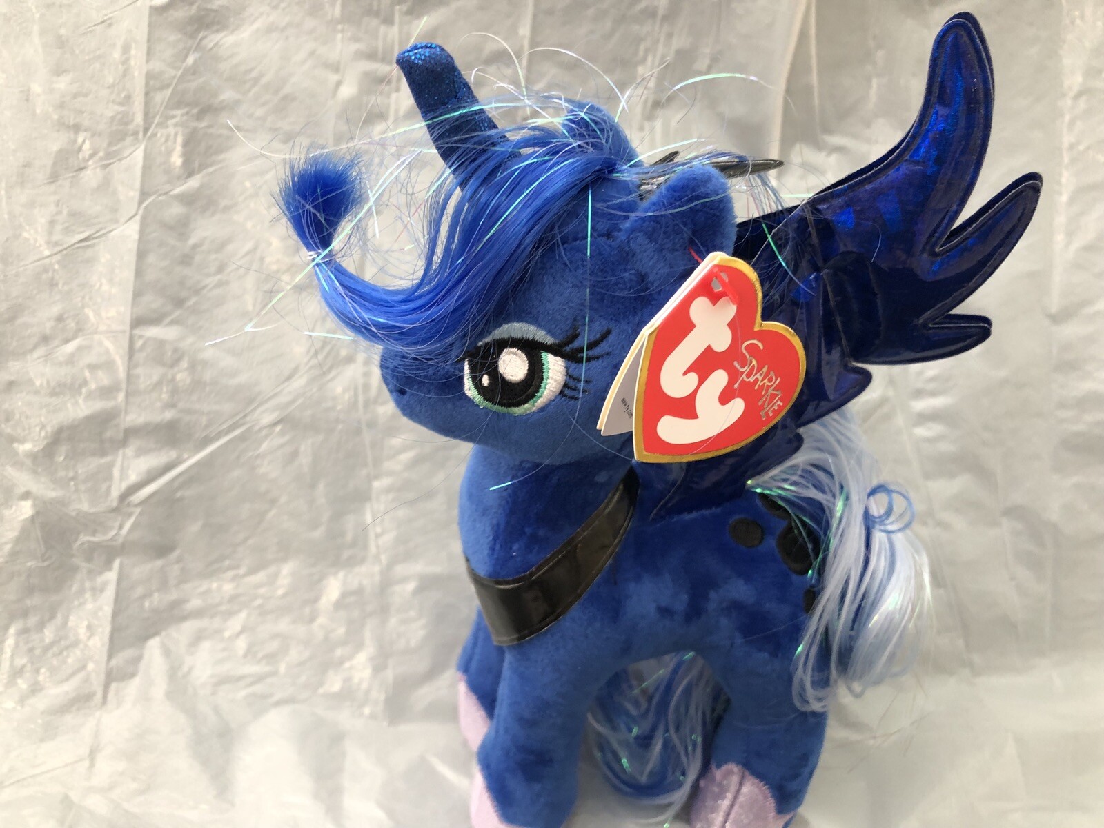 This beautiful 9 inch plush unicorn from Ty's Beanie Babies collection is a must-have for any My Little Pony fan. With its stunning purple and black design inspired by Princess Luna, this Beanie Baby is sure to add some sparkle and magic to your collection. Made with high-quality materials, this plush toy is soft and cuddly, perfect for both kids and adults alike. Featuring the iconic Ty brand, this Beanie Baby is a classic collectible item that is highly sought after by collectors. With its retirement from the market, this Beanie Baby is even more valuable and rare. Don't miss out on the chance to add this amazing item to your collection. Selling NEW "My Little Pony" toys, 3 for $25.00