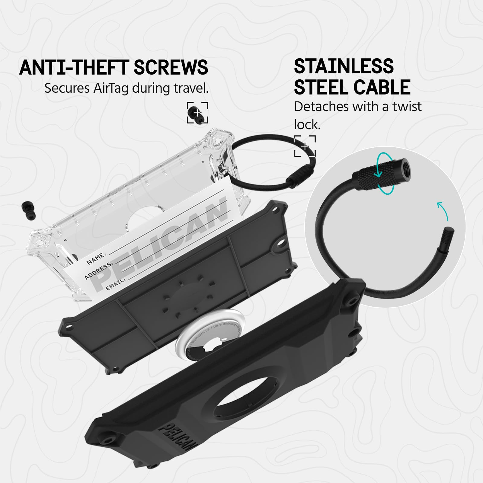 The AirTag holder is a rugged and practical accessory that securely holds your Apple AirTag, allowing you to track down your luggage, backpack, or gear wherever you go. It comes with an interchangeable name card that is protected with a clear window for easy luggage identification and retrieval. The luggage AirTag holder is extremely durable and has an anti-scratch coating, steel reinforcement plate, and MIL-STD drop protection. The stainless steel loop with an easy twist and lock mechanism ensures that AirTag won't fall out or get misplaced. The protective hardshell opens with real replaceable screws. This ultimate travel companion is suitable for bags, suitcases, travel spinners, instrument cases, gears, strollers, and more. Luggage AirTag Holder Features: Compatible with Apple AirTags Secure Attachment to Your Belongings Interchangeable Name Tag Anti-Scratch Coating Steel Reinforcement Plate MIL-STD Drop Protection Stainless Steel cable with Twist Lock Mechanism Protective Hardshell Opens with Real Replaceable Screws Comes with an Allen Wrench 1-Year Limited Warranty Who are we: At we have gained prestige among our buyers by protecting what matters the most and we are now a leading supplier of rugged cases. We always strive to create products with the latest tech, premium materials, and extreme standards. We have a collection of defensive cases, waterproof cases, and screen protectors for the recent flagship like the iPhone 14 Pro Max, iPhone 14 Pro, iPhone 14 Plus, iPhone 14, S23 Series, Pixel 7 Pro, iPad, AirPods, and more. Luggage Tracking: The luggage tag and AirTag holder is a rugged and practical accessory that securely holds your Apple AirTag, allowing you to track down your luggage, suitcase, or travel bag wherever you go; With this accessory, you can travel with peace of mind, knowing that your bag's location is just a click away Ultimate Travel Companion: This AirTag holder is a travel-friendly and versatile luggage accessory that allows you to securely attach it to your bag; It also comes with an interchangeable name card that is protected with a clear Co-Polyester (PCTG) window, making it extremely rugged and resistant to wear and tear Unbeatable Durability & Strength: This Mil-spec certified luggage tag holds an airtag and name card in a scratch resistant, steel plate reinforced, protective two piece design. The luggage tag also features a stainless steel cable with easy twist lock mechanism, allowing you to securely attach your AirTag to your belongings Reliable & Sturdy Locking: The protective luggage tag and AirTag case has a reliable screw-locking mechanism that securely and tightly closes both sides of the holder, making it perfect for any adventure; This industrial AirTag luggage tag protects your equipment & luggage no matter where your travels take you Package Contents: 1 Unit of Luggage Tag AirTag Holder - Black + (1) Interchangeable Name Card + (1) Allen Key Wrench + (1) Extra Screw; 1-Year Limited Warranty, (AirTag not included)