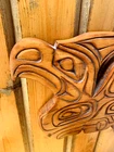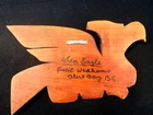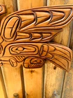 "Sea Eagle" Wooden Carving by Cecil Wadhomes (Alert Bay) Indigenous Indigenous artwork on the Pacific Northwest Coast often incorporates figures and animals that are related to crest symbols. Crests have been passed down through families and have varying meanings depending on the context and association with a nation, clan, or family. The figures depicted in contemporary Northwest Coast Indigenous artwork also have varying meanings but there are some common characteristics from a range of sources, including oral histories and artist descriptions. Eagle is an especially prominent figure in artwork on the Northwest Coast. There is a large population of eagles along the coast of the Pacific Northwest. Eagle is one of two crests among the Haida and Tlingit, and one of the main crests among the Tsimshian and Heiltsuk. It is typically respected for extraordinary vision, in both the literal and figurative senses. Eagle is considered one of the most sacred figures as it has been said to carry the prayers of the people to the Creator and Eagles are frequently referenced in ceremonial contexts. Eagle feathers and down are customarily used in a variety of different ceremonies such as honouring a respected guest. In Northwest Coast artwork, Eagle is often depicted with a hooked beak and small ears.