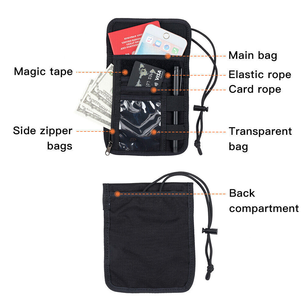 Product Description Feature: 1.Made of 1000D Cordura Nylon Material with a magicsticker-close pocket, a zipper pocket, 2 front card slot, a pen loop and a back pocket. 2.Adjustable disassembly of the neck lanyard, the passport holder for neck has matte split rin for keysg, lanyard, carabiners. this passport pouch for passport that can have your valuables and handy items around your neck. 3.An ideal lanyard for passport pouch,this neck travel pouch can be used to holdcell phone, earphone, keychain, keys, small gadget, pens, ID cards, credit cards, license, cash, passoort, etc. Everything else you need readily accessible. 4.Neck wallet for travel suitable for ID-card, EDC wallet and important small files that can be hung on your neck, the passport wallet neck holder can be used for student cards, work cards, outdoor sports, travel, leisure and so on. 5.100% Quality Warranty: Your satisfaction is our first priority, If you encounter any problem while using, never hesitate to send email to us and we will make it all right for you. Type: Tactical Waterproof Document Bag/Multi-function Document Holder/Military Fan Equipment/Portable Card Holder ID Card Material: 1000D Nylon Size: 18.5*14.5cm/7.28x5.7inch Weight: 88g Color: Black Package Included: 1 X Passport Holder Neck Pouch ( Patch Not Included)