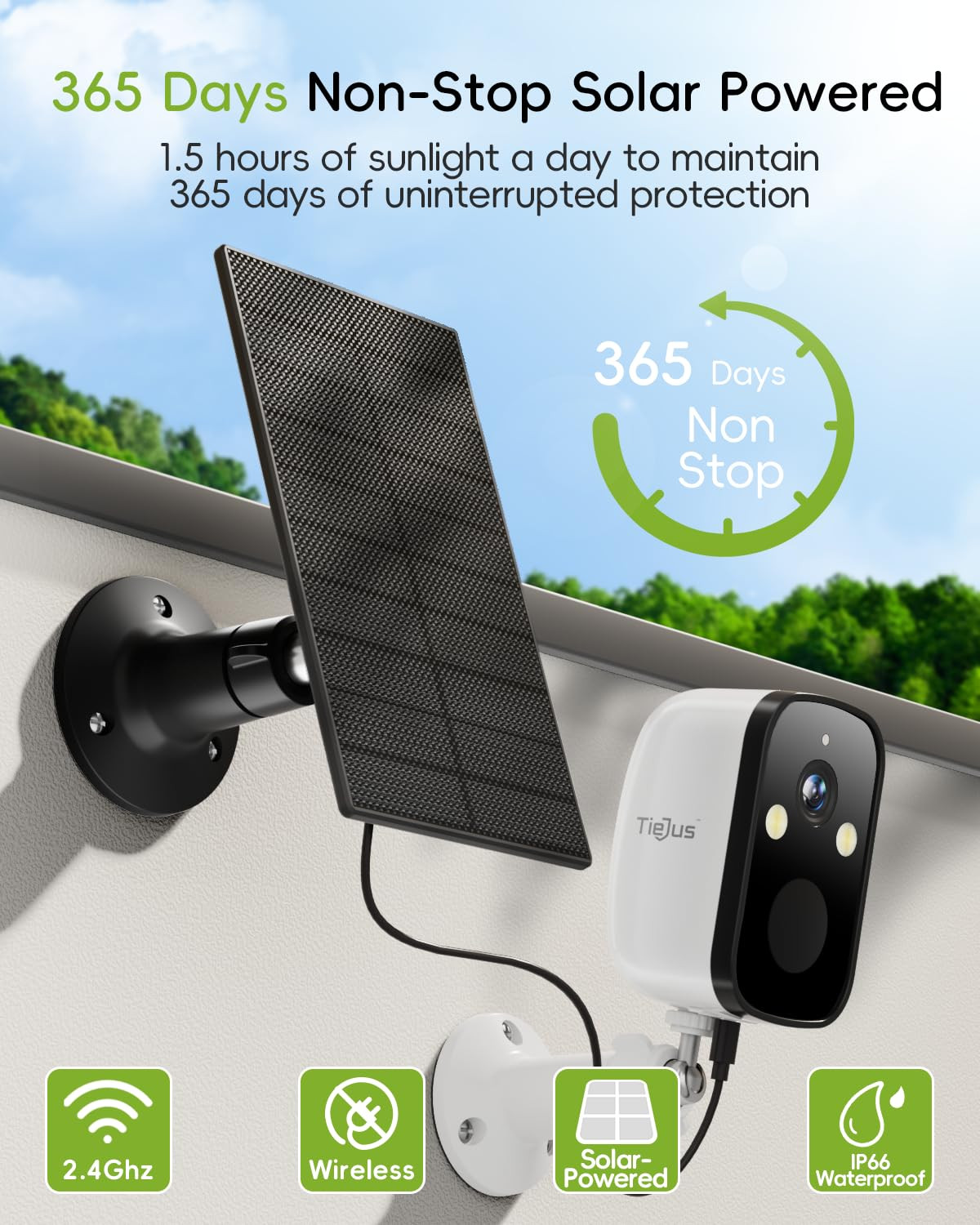 Cloud & Memory Card Storage: security camera wireless outdoor support memory cards and cloud storage. Recorded videos are backed up and accessible anytime. Multiple users can view live feeds. Includes 3 days recurring cloud storage at no cost Non-Stop Solar Powered: This solar security camera wireless outdoor solar-powered have ETFE solar panels, boosting efficiency by 22%, providing 365 days of protection with 1.5 hours of sunlight daily. Upgraded waterproofing and durable design withstand -4°F to 140°F O-KAM Pro APP & DIY Alarms: Solar security camera outdoor work with the O-KAM Pro app, featuring PIR sensor, AI detection, and 36 customizable alarm sounds. The app supports multiple cameras and sends real-time notifications and emails upon motion detection 2K Resolution & Full Color Night Vision: This solar wireless cameras for home security outdoor deliver 2K video quality with 2 white lights and 4 IR lights for clear images in complete darkness, and this solar camera outdoor wireless with a viewing range up to 55 feet Wireless & Easy Installation: This solar security camera outdoor solar-powered connect via 2.4GHz Wi-Fi.solar camera outdoor wireless easily install the solar panel and camera with provided brackets and screws for a wireless, hassle-free setup Suitable for Various Scenarios: The solar outdoor camera wireless are ideal for front doors, backyards, and more. Recommended for well-lit areas to ensure optimal solar charging and continuous operation