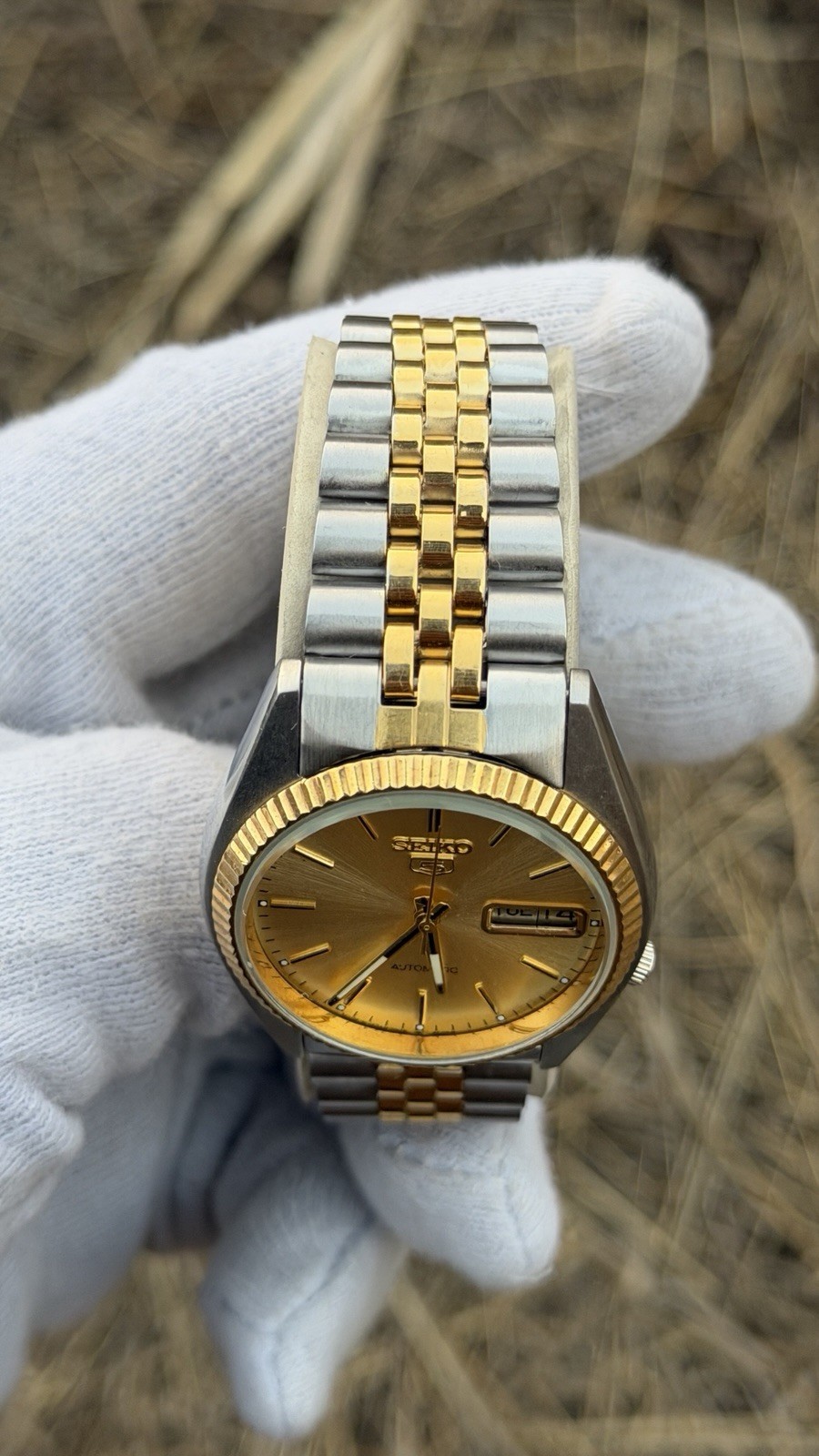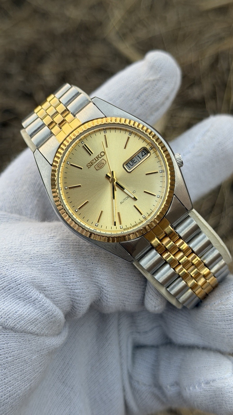 The Seiko 5 Men's Automatic Watch with a fluted bezel and day/date feature is a vintage timepiece with a classic design. This round watch has a silver dial with stick indexes and a sunburst pattern, housed in a stainless steel case with a polished finish. The watch is equipped with a mechanical automatic movement and a 36mm case size, making it suitable for dress/formal occasions. With a left-handed design and a bracelet band made of stainless steel, this Seiko 5 watch is a stylish and reliable choice for men looking for a traditional yet functional timepiece.