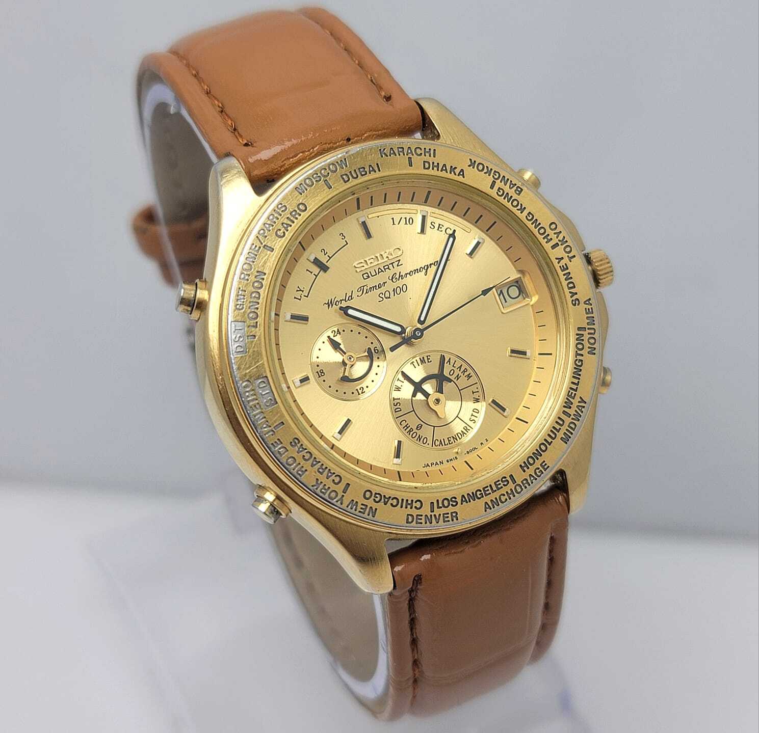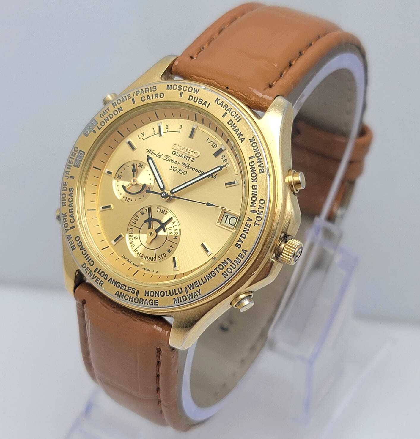Up for sale is this beautiful Pre-owned [Seiko World Timer Chronograph SQ100] CONDITION OF WATCH Watch is in Very Good Condition and Working Perfectly DEFECTS OF WATCH Watch have Some Minor Scratches and Its Strap is After Market MEASUREMENT OF WATCH: Case width with crown is 43 mm Case width without crown is 41 mm Case thickness is 11 mm Lug width is 19 mm PRODUCT CODE: USA27SAH25 ABOUT PACKAGE: All items will be carefully packed and shipped to you in a box or envelope bags. ABOUT ECONOMY SHIPPING: Economy shipping cost is $14 usd and it will take upto 30-60 days to deliver the item in the country of the buyer and we do not ship in these following countries with economy shipping: India, Israel, Macau, Kenya, Reunion, Canada, Mexico, Greenland, Australia, New Zealand, Puerto Rico, Costa Rica, Argentina, Colombia, Cyprus, Ireland, Lithuania, Sweden, Spain and Taiwan because in these countries ebay does not show delivery status, In these countries we can only send items by standard shipping which costs $35 ABOUT STANDARD SHIPPING: Standard shipping cost is $35 and it will take up to 7-20 days to deliver the item in the country and it will be available in almost all of the world except india and Israel. If you have any questions or concerns about your order, for example, goods not received, item is not as described, the quantity is incorrect, the product is defective, please contact us before you open a dispute or leave a negative feedback, we will try our best to solve the problem for you, thank you for your understanding and help.