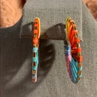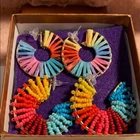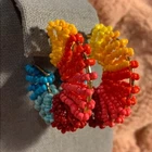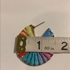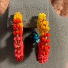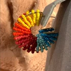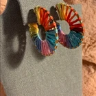 Multi- Colored Semi-Circle Gold Rim Earrings. One pair is beaded and the other is made with a raffia. Yellow, orange, red, pink, blue, green. Brand new, never worn.