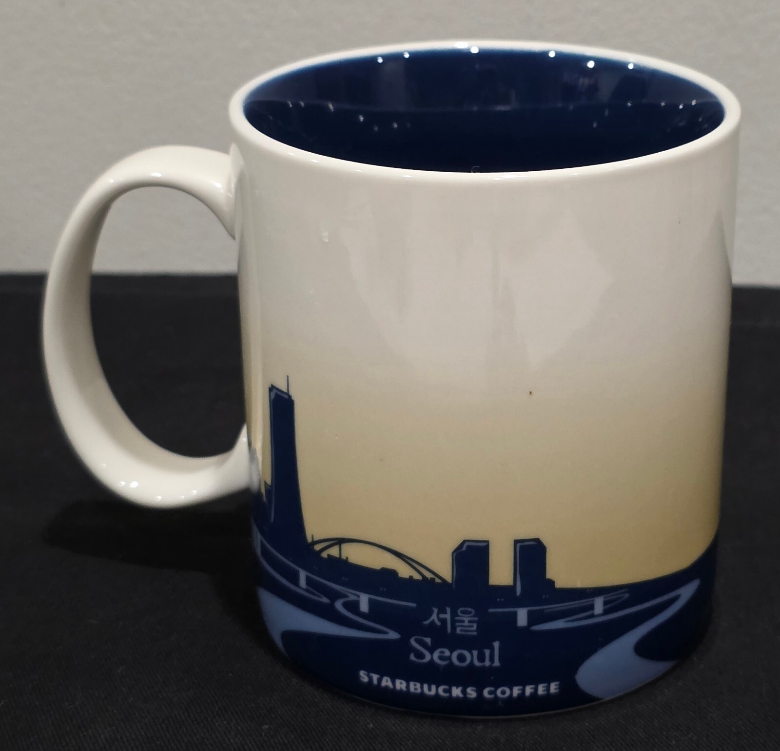 Starbucks Seoul South Korea Global Icon Collector Series Coffee Mug Cup 16 oz Measures 3.75" in Diameter x 4" High Very Good Condition with no chips, cracks, repairs or stains