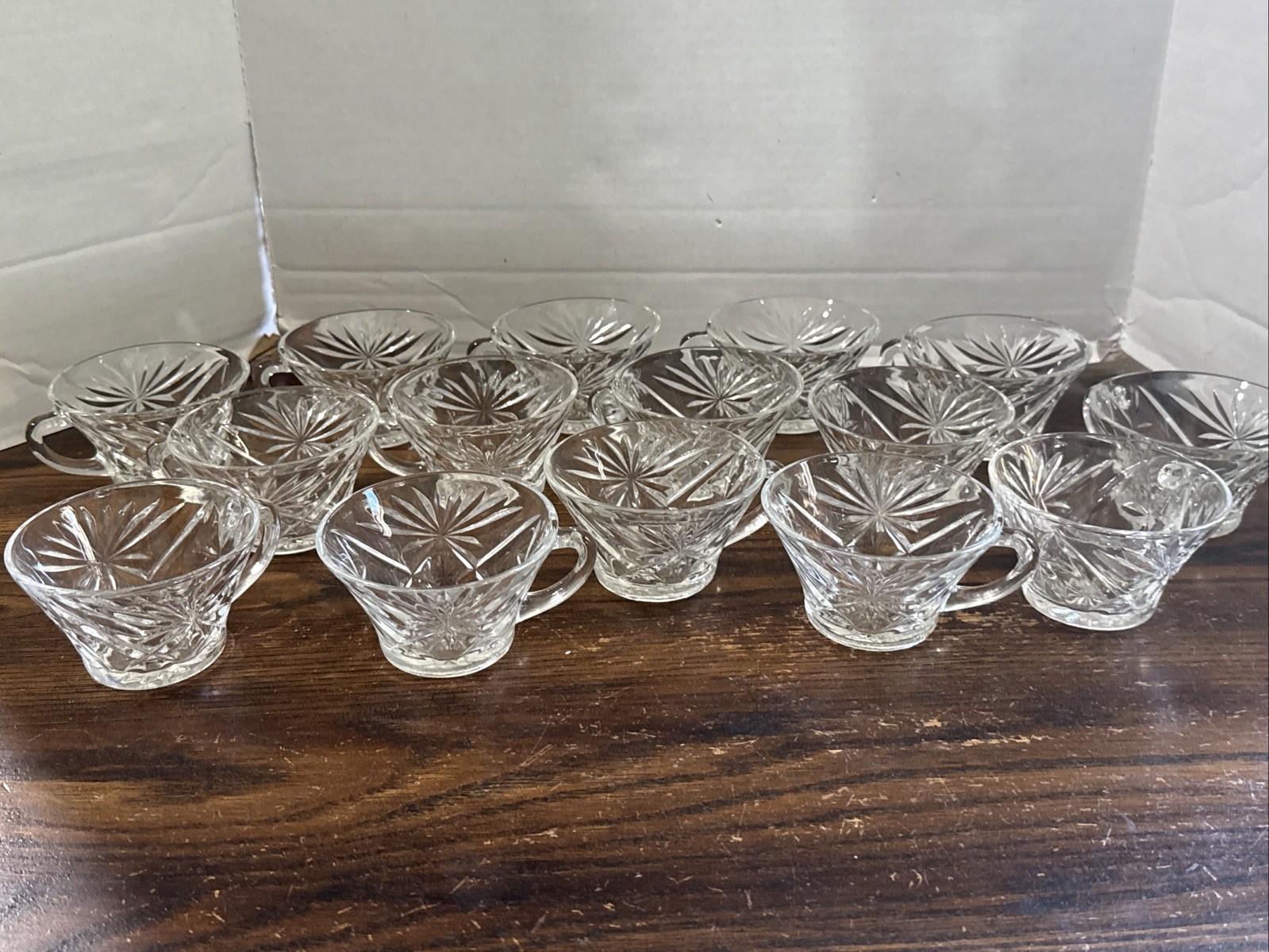 This set of 15 vintage Anchor Hocking Star of David glass punch bowl cups features a starburst pattern on a round shape, perfect for all occasions. Made of clear glass in a mid-century modern style, these punch glasses are dishwasher safe and originally produced in the United States. The elegant design and pressed glass technique make them a unique and stylish addition to any drinkware collection.