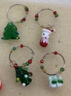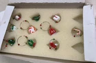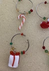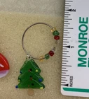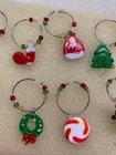 This is such a cute set of 10 little glass wine glass markers -- all Christmas themed! Very nice condition, although it's clear from the box that there were originally 12. The include 2 trees (one flat, one 3-dimensional), candy cane, Santa hat, stocking, wreath, peppermint candy, 2 gifts, and a tiny santa/elf figure. They are meant to go around the stem of wine glasses, but I think you could also easily turn them into ornaments for a tiny tree.