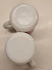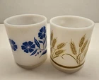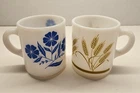 This set of 4 vintage Hazel Atlas milk glass mugs features a 1950s pattern with red rooster, blue cornflower, gold harvest wheat, and green (teal?) teapots. These collectible mugs are perfect for all occasions and can be used for both hot and cold beverages. Hand wash only to maintain their original charm and vintage appeal.