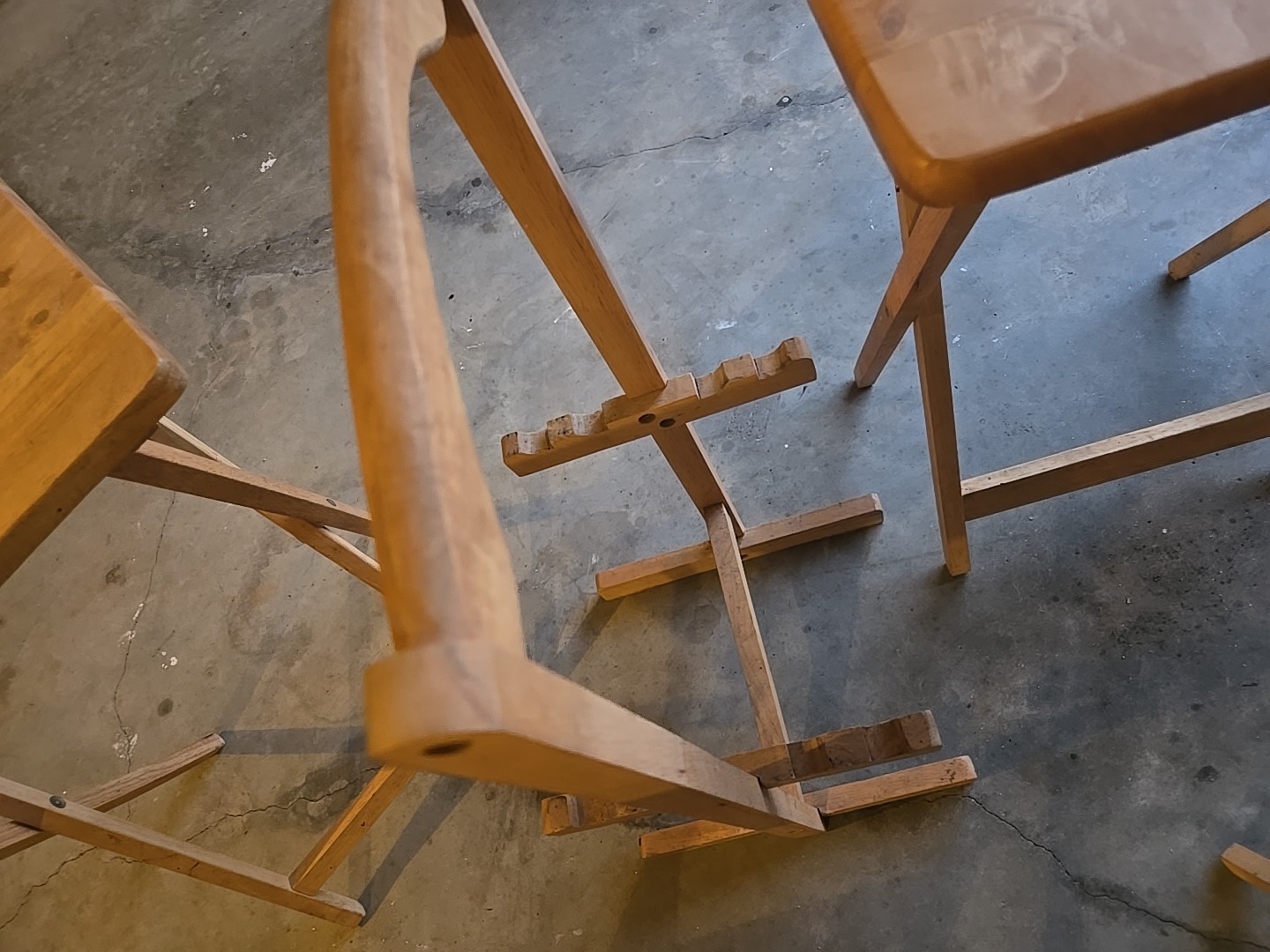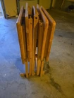 This set of 4 solid wood TV snack trays folding tables with stand storage rack is made of light yellow wood with a square shape. The medium-sized serving tray features a stand for easy placement and storage. Made in Thailand, these brown trays are sturdy and weigh 38lbs each, providing a stylish and practical solution for serving snacks during TV time.