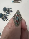 Earrings with two rocks were handmade and purchased at an art show. Earrings with beaded dangles are from an antique store. Large leaf earrings and rings from estate sale.