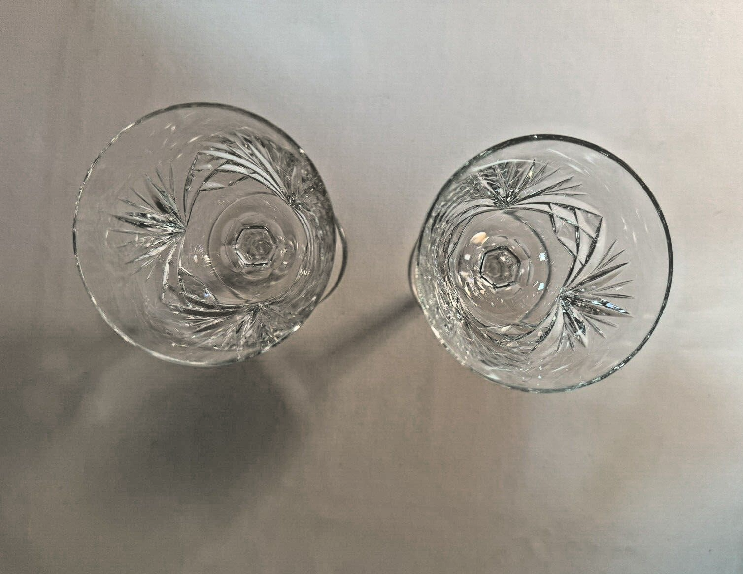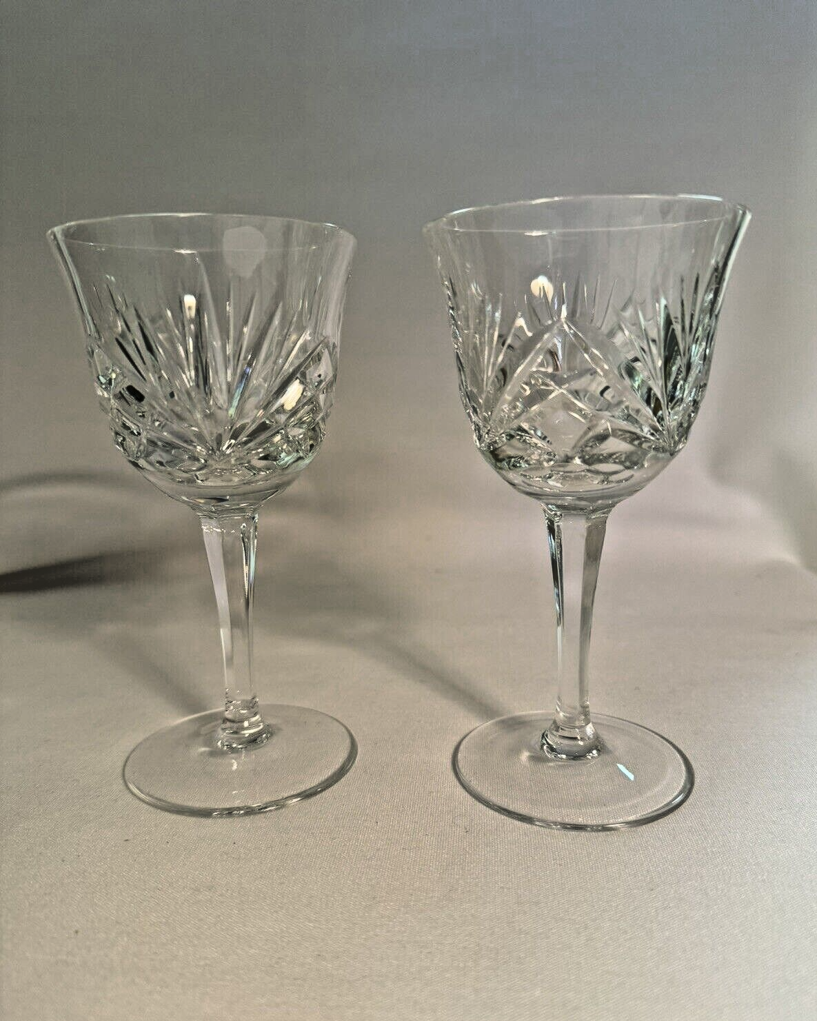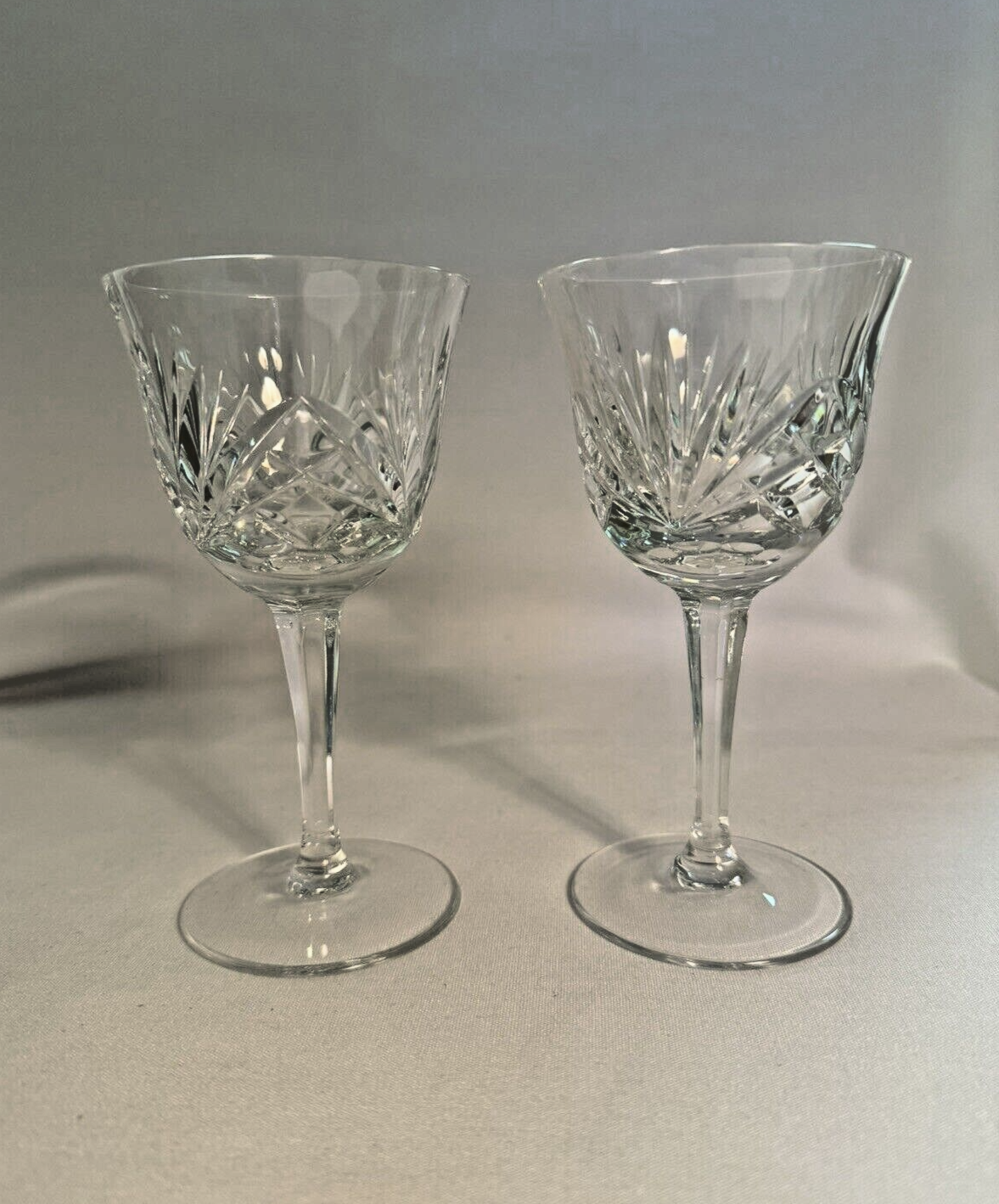Pair of beautiful, shiny and bright, Gorham crystal, Cherrywood pattern, wine glasses. Each is 5 5/8" tall. Signed "Gorham" on the bottoms of each. No cracks, dings, nor chips. If you wish to see more pictures, or have any questions, please ask. What you see is what you are buying. No returns on crystal. Thank you for looking!