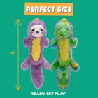 These premium plush toys come in an exciting variety of cuddly critters and colorful characters. Flipsterz are twice the fun with 2 crazy contrasting friends to flip back and forth for extra fun and excitement in your interactive play with your pet. Along with being soft to hug and fun to tug, each toy comes with a full body squeaker that’s perfect for playtimes. Disclaimer: For pets only. Pets should be supervised during use. The toy is not meant to be consumed as ingestion of any non-food item is dangerous to your pet's . If product is excessively worn, damaged, or any part becomes loose or detached, discontinue use and replace as needed. RANDOMLY SELECTED: Only dog toy is supplied, and it is randomly selected from the assortment shown; customers currently do not have the option to choose their desired toy variant FLIPPIN' FUN: Shake & Squeak Flipsterz are double-sided plush toys with contrasting animal characters to flip between for twice the fun and excitement; featuring soft textured plush fabric that dogs and puppies love to play and cuddle with BUILT-IN SQUEAKER: Designed with a full-body built-in squeaker to entice and excite your pup, satisfying their hunting instincts to keep their interest during solo or interactive play INTERACTIVE PLAY: The long plush body of the Flipsterz toys make them great for interactive play between pet and owner; games such as tug or toss are great and super fun ways to bond with your dog FUN & ENRICHMENT: The immediate auditory feedback of squeaker toys excite dogs and encourages play; they are designed to provide enrichment and stimulation, catering to natural and instinctual canine behavior to keep your pup actively entertained PRODUCT DETAILS: Assorted (Dino-Sloth OR Lion-Elephant); 14", Size RECOMMENDATIONS: Pets should be supervised during use; item should be removed if excessively worn, damaged, or any part becomes loose or detached