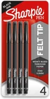 SHARPIE Felt Tip Pens, Fine Point (0.4mm), Black, 4 Count Color-full, brilliant shades ignite thought-provoking messages Ink won't bleed through paper and is acid-free and archival-quality Quick-drying ink is both water- and fade-resistant; AP certified Fine point and slim, contoured design for effortless detail and control Includes: 4 black Sharpie fine point pens