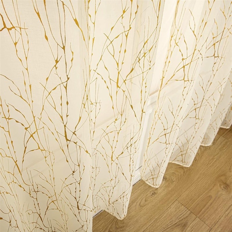 About this item 【Ready-Made】:Sold as pair, package comes in 2 panels sheer curtains. Each panel measures 52 inch wide by 96 inch long.Top 3" rod pocket design fit the the most standard rod, convenient to hang and slide. These sheer panels are made of 100% quality polyester, soft, durable and breathable. Unique gold bronzing metallic printed curtain set and patterns inspired by the distinctive of forest tree branch. 【Golden Foil Print】:We have updated the gold bronzing tech print which is more eco-friendly. The patterns are vivid, shiny, glittering and sparkling.They are perfect for your both vintage and modern golden theme decorations. 【Aesthetic Stylish】These window treatment sheer curtain drapes are full of fashion beauty and design. The printed artistic tree branch patterns that creating natural and elegant atmosphere. 【Privacy Curtains】:These sheer curtains let natural light and fresh air in but still provide enough privacy. They are great ideal decorations for bedroom, living room, dining room, nursery room,farmhouse room and kitchen window. 【Easy Care】: Machine washable in cold water with a mesh laundry bag. We recommend hand wash. Gentle cycle, do not bleach and Low iron. Brand: Color: Gold and Cream Material: Polyester Product Dimensions: 96"L x 52"W Opacity: Sheer