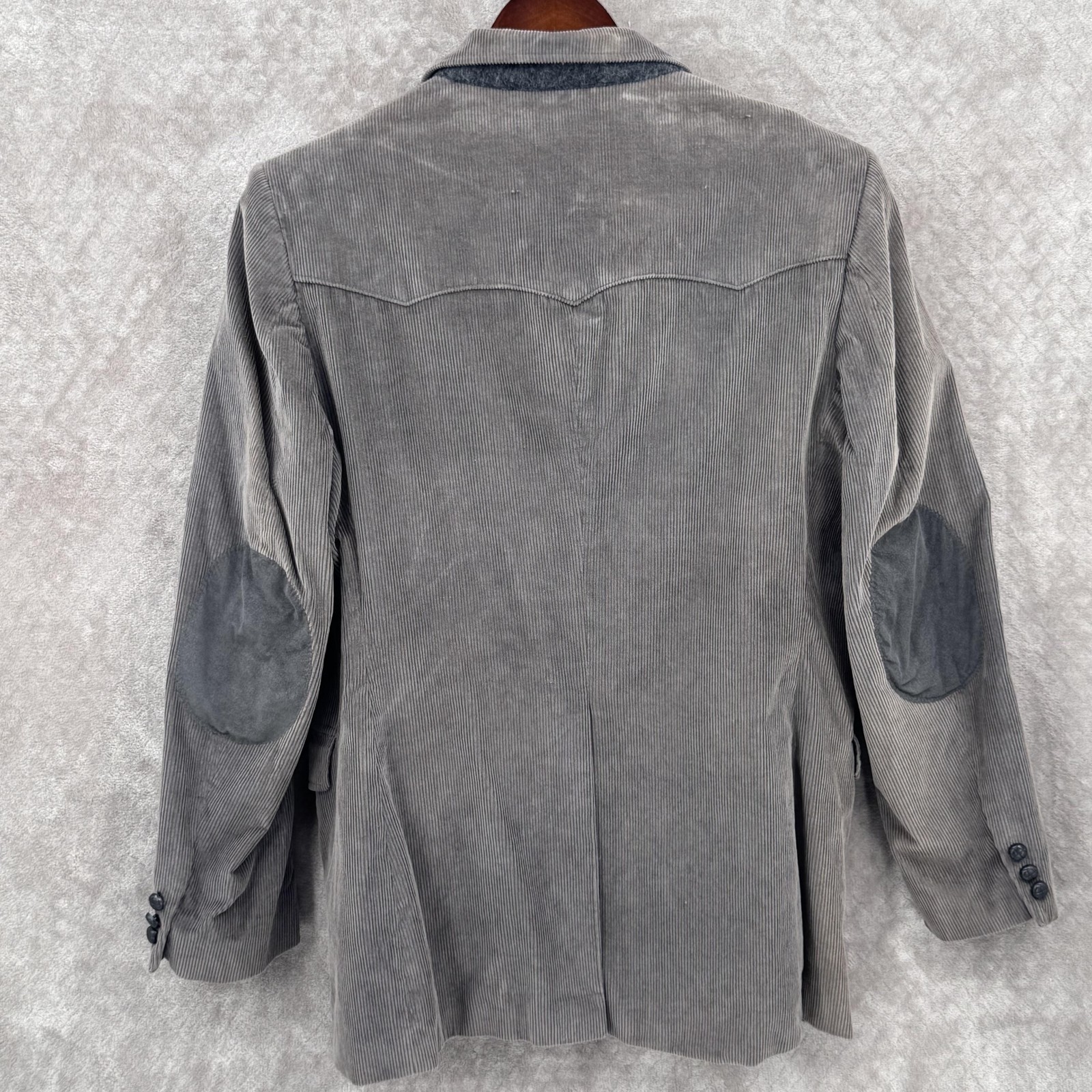 Sheplers Sport Coat Blazer Mens 42L Gray Corduroy Western Elbow Patches Cowboy Pre-owned Vintage Sheplers western corduroy sport coat with wear from regular use and cleaning. Corduroy shows overall texture wear, and fading with noticeable discoloration along the inside collar as shown in photos. Buttons, elbow patches, lining, seams, vents, and pockets are intact and functional with no holes or tears. Brand: Sheplers. Style: Mens western sport coat blazer with a classic single-breasted long fit silhouette. Color: Gray. Tag size: Mens 42L (42 Long). Material: Cotton and rayon corduroy shell with viscose/rayon woven lining. Design details: Notch lapel collar, two-button front closure, front and back western yoke panels, long sleeves with three-button cuffs, and two lower front flap pockets. Features: Fully lined interior with multiple inner welt pockets including a buttoned chest pocket, contrast elbow patches for a traditional western look, and long length for added coverage. Pattern and texture: Solid gray fine wale corduroy exterior with a smooth, lightweight woven lining. Branding and labels: Interior Sheplers logo label with steer head graphic and text reading "THE WORLD'S LARGEST WESTERN STORES," size 42L tag at inner collar, and interior care label noting cotton/rayon shell, viscose/rayon lining, made in China, and dry clean only instructions. Country of origin: Made in China. Care: Dry clean only. Occasion and use: Suitable for business casual wear, western events, country concerts, and everyday wear with jeans or dress pants in cooler weather. Special notes: Sheplers mens gray corduroy western sport coat blazer in size 42 Long. 113020