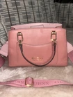 The product is a small rectangle shaped shoulder bag and handbag by Guess, featuring gold hardware and an adjustable shoulder strap. The exterior is made of faux leather in a pink color with silver hardware accents. The bag has a zip closure and is lined with fabric. It is not vintage and is designed for women who appreciate designer accessories. Perfect for carrying everyday essentials, this stylish bag combines fashion and functionality with its adjustable strap for added convenience.