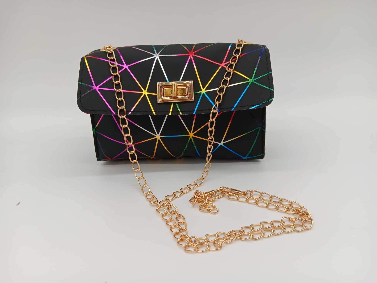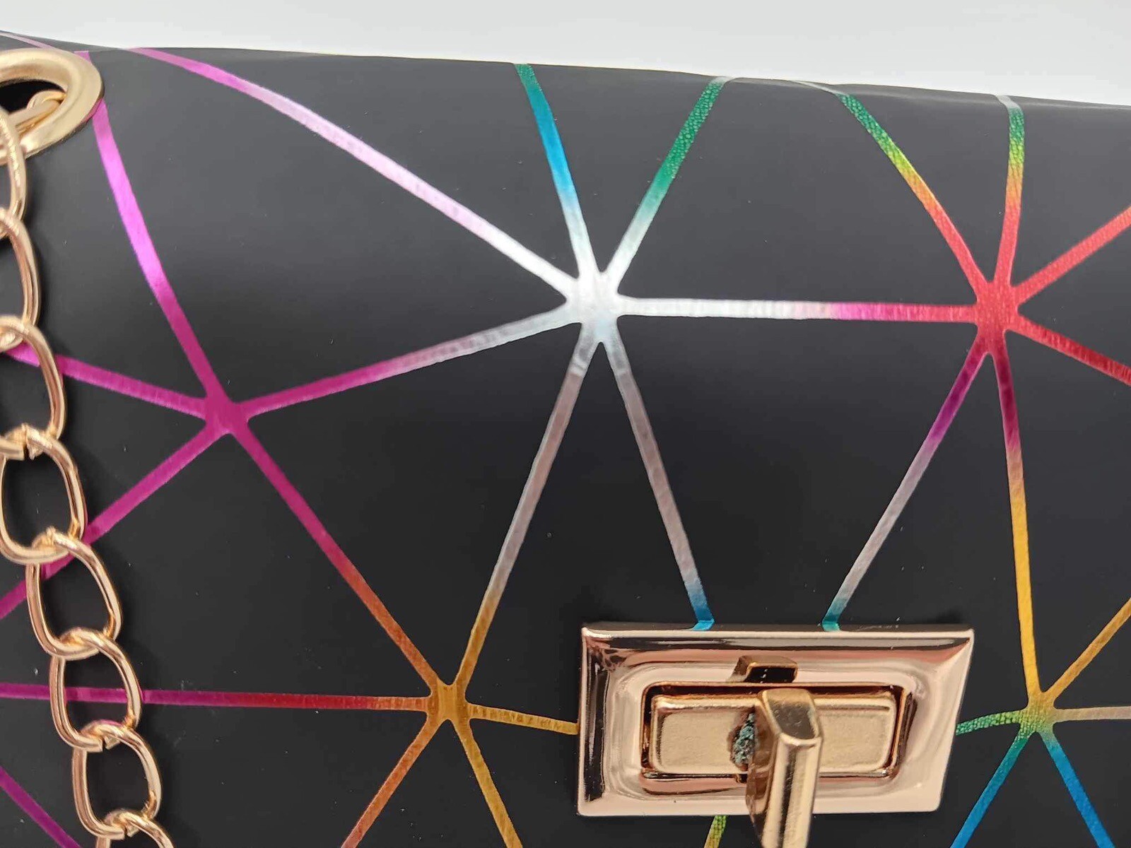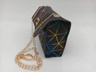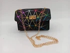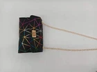 Elevate your style with this chic shoulder bag from Black And White. The geometric pattern in aged black makes a bold statement, while the gold crossbody strap adds a touch of glamour. The magnetic closure keeps your essentials secure, and the detachable strap provides versatile carrying options. Crafted from acrylic and lined with yellow grosgrain, this small bag features bronze hardware and a matte finish. With a bag width of 9.8 inches, a height of 6.6 inches, and a depth of 3.5 inches, it is perfect for a day out in the city. The Yves Saint Laurent Loulou product line inspires the design, and the Wonder Girl character adds a playful touch.