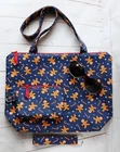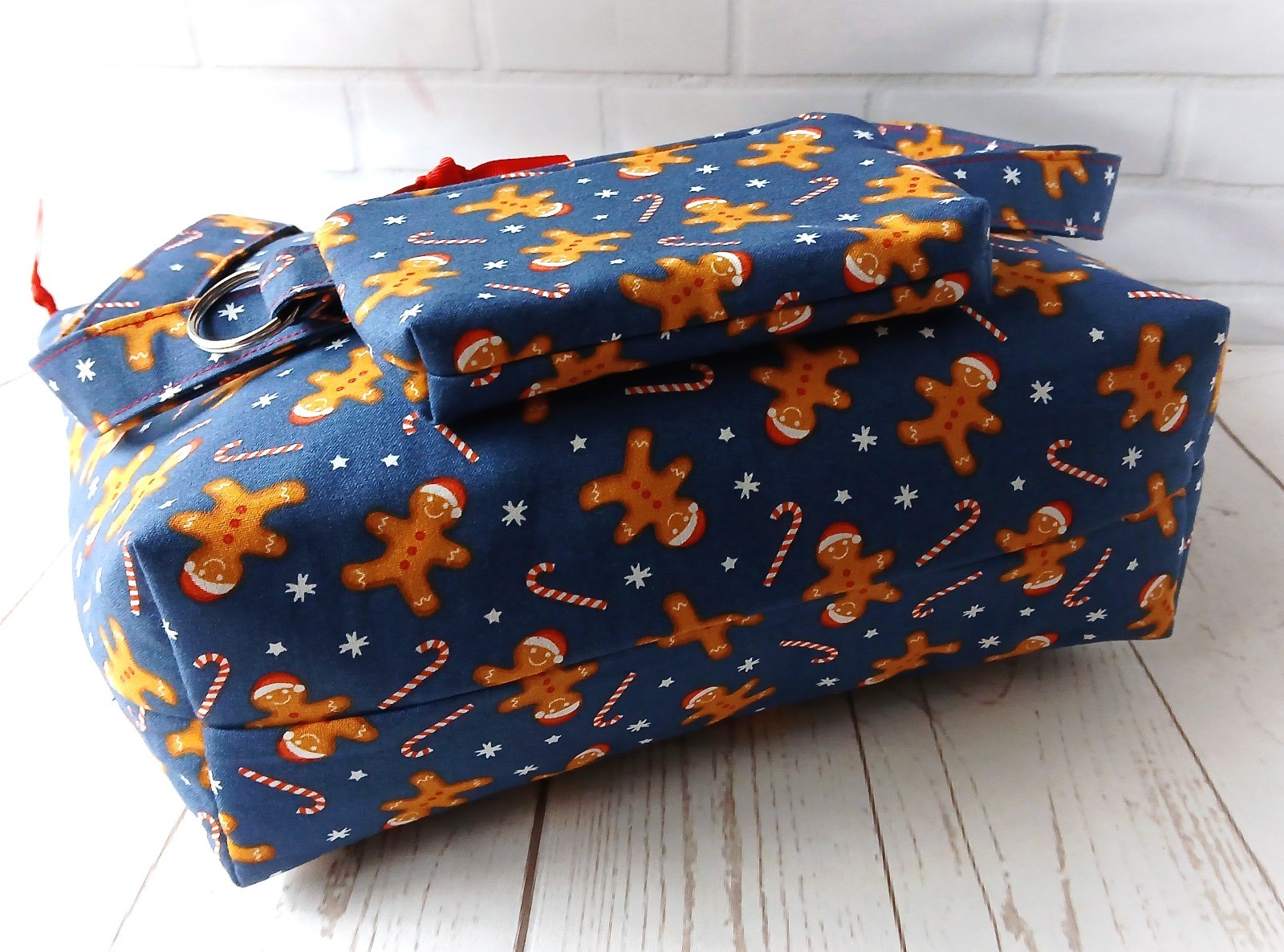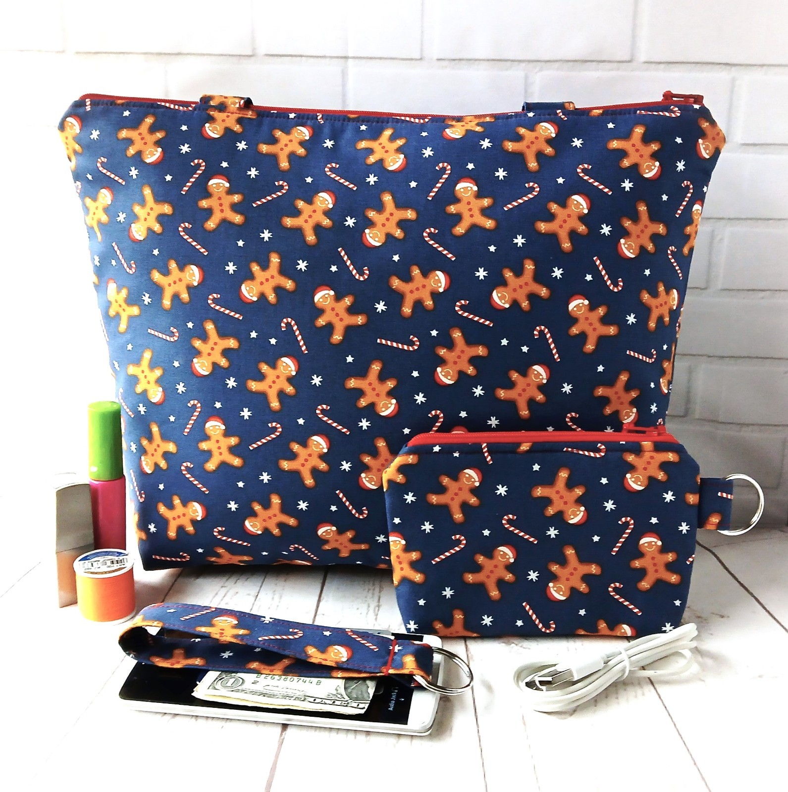 This Shoulder Bag is so versatile. Great to use everyday or when you travel. It has a zipper closure to keep your items secure. T wo inner pockets to organize your essentials. Comes with a matching coin purse and wristlet keychain to carry the purse or your keys handsfree. Lovingly crafted and made to be one-of-a-kind pieces that reflects your individual style. Excellent gift choice for friends, family, or yourself. NEW - Handmade. Lined and padded. Bag Measures: 14" W x 10.5" H x 4" D with a 13" zipper opening. Strap Drop: 13.5" Coin Purse: 6 " L x 4.25 " H x 1" D with a 5" zipper opening. Wrist Keychain: 1" x 6" with a 5" opening. Each piece is made with a gingerbread man toss fabric. Lined in a matching red dots fabric. Padded with a cotton batting. All of the seams are back tacked, doubled stitched for strength. Top stitched below the zipper. Handmade by me in a pet free, smoke free home. Buy with confidence. Quality made. 100% Cotton Fabrics - Wipe with damp cloth or wash "cold" gentle cycle, tumble dry low. Press if needed. View my other items. They make great gifts! Thank you for supporting my small business. Thank you for buying handmade.