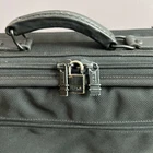 One zipper pull missing and no key for the lock. Zippers function no holes or tears.
