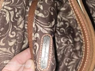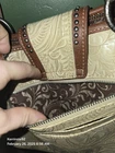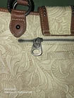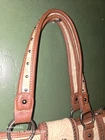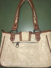 The Shyanne Concealed Carry Shoulder Purse is a stylish and functional bag designed for the Western cowgirl aesthetic. Made from faux leather with whipstitch, studded, and zipper accents, this satchel/top handle bag features a cream exterior with brown and cream handle/strap color. It has a zip closure, inner and outer pockets, bottom studs, and is lined with multicolor fabric. With a medium size and double handles, this purse is perfect for travel, casual outings, or business use, offering a mix of practicality and Western flair.