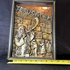 Resin on copper repousse. Signed bottom right corner. Subject depicts a man blowing a horn near the western wall where Jews pray for forgiveness for their sins on Yom Kippur. Framed in wooden frame with gilt accent. Frame measures approx. 9.75 W x 13.5 H in. Window measures approx. 8.5 W x 12.75 H in. Not viewed outside of frame. Separations in gilt accents at frame corners. Wear consistent with age. Relief sculptures, high relief sculptures, framed sculptures, copper repousse, repousse, framed repousse, Jewish art, Yom Kippur, signed art, signed artwork, artist signature, home decor, interior decor, Yigal Yom Kippur Western Wall High Relief. 9 artwall