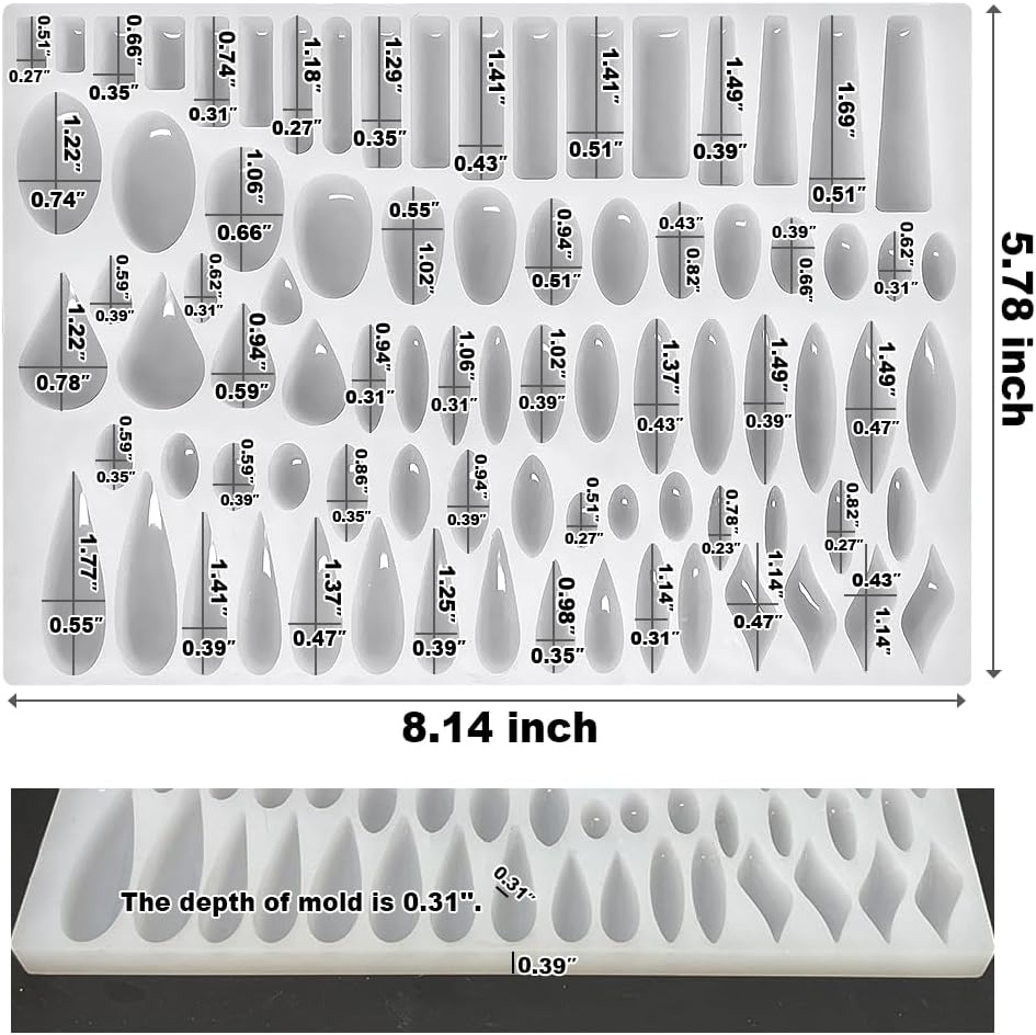 【82-Cavity Varieties of Size & Shapes Jewelry Casting Molds】: These molds set contains 41 Paired Different Shapes, including teardrop oval rectangle dangle drop and more shapes 【Super Thick & Shiny Silicone Jewelry Mold】:This mold is made from thick silicone with shiny surface, It has smooth interiors, the finished pieces are easy to take off from the mold 【Multiple Usages】: There are many possibilities with these resin molds set, they can be used to be make resin stud earrings, resin dangle drop, resin keychain pendant 【Compatible with Various Casting Material】: These cute silicone molds are compatible with most casting material such as epoxy resin, UV resin, plaster, gypsum, clay 【After Sales】: We know how important the quality is to you. If there is any issue with our product, you are always welcomed to contact us, and we will try our best to give you a satisfactory solution Product Description Specification Package Include: 41 paired jewelry earring pendant silicone molds Size: Display in the second of the detail pictures Material: Silicone Silicone mold only! The finished products and other accessories are not included! Resin Casting Molds from ResinWorld Add to Cart Add to Cart Add to Cart Add to Cart Add to Cart Add to Cart Customer Reviews 4.4 out of 5 stars 33 4.6 out of 5 stars 90 4.5 out of 5 stars 51 4.5 out of 5 stars 62 4.5 out of 5 stars 147 4.7 out of 5 stars 318 4.5 out of 5 stars 85 Price $18.99 $ 18 . 99 — $12.99 $ 12 . 99 $9.99 $ 9 . 99 $12.99 $ 12 . 99 $12.99 $ 12 . 99 $12.99 $ 12 . 99 Mold Size 12'', 9'', 7'', 5.7'' / 3'', 1.87'', 1.37'' / 5'' x 1'' / 10 Different Sizes Materail Silicone Silicone Silicone Silicone Silicone Silicone Silicone Easy to Demold ✔ ✔ ✔ ✔ ✔ ✔ ✔ Easy to Clean ✔ ✔ ✔ ✔ ✔ ✔ ✔ Sturdiness ✔ ✔ ✔ ✔ ✔ ✔ ✔