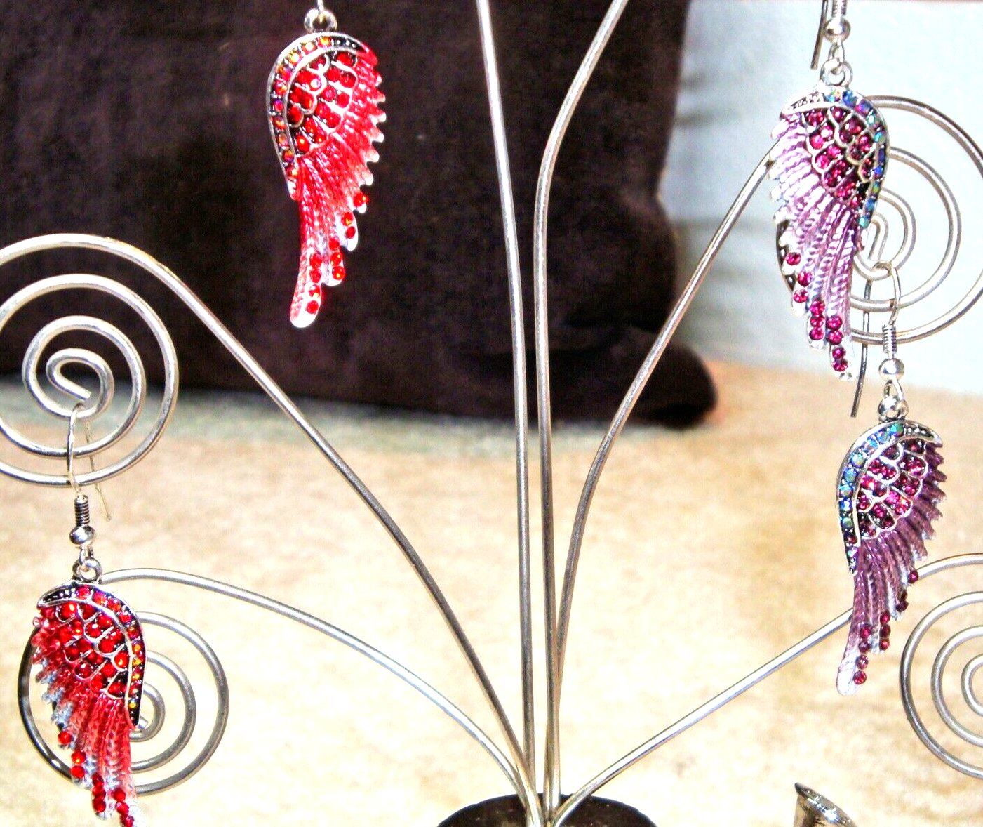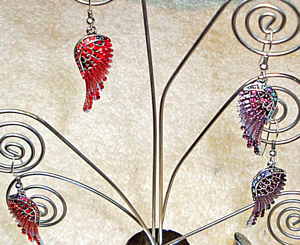 2 Pairs. Add a touch of heavenly style to your look with these beautiful Angel Wings earrings. These dangle/drop earrings feature a silver tone setting with a hook closure, measuring 2 inches in drop length. The unique design showcases pink & purple crystal as the main stone color, bringing a pop of color to any outfit. Perfect for any occasion, these earrings are a must-have addition to your jewelry collection. Bin E 46