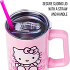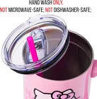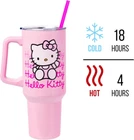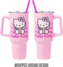 Silver Buffalo Sanrio Hello Kitty Waving 40 Ounces, Product Details Brand: Silver Buffalo Color: Hello Kitty Waving Special Feature: Hand Wash Only. Not for Microwave Use. Style: Modern Theme: logo Recommended Uses For Product: Home and Kitchen Occasion: Any Occasion Included Components: 40oz Tumbler, Lid, and Straw Shape: Round Pattern: Hello Kitty Product Care Instructions: Hand Wash Only Age Range (Description): Adult Material Feature: Insulated Reusability: Reusable Unit Count: 1.0 Count Product Dimensions: 4.1"W x 12.2"H Material Type Free: Not Ceramic Number of Items: 1 Manufacturer: Silver Buffalo Size: 40 Ounces Item Weight: 1.21 pounds Item model number: KTY659S5 MaterialCapacity: Stainless Steel40 Fluid Ounces HELLO KITTY: Join Hello Kitty with this double-walled stainless steel travel tumbler that holds 40oz. Designed in a pink background, it features Hello Kitty sitting and waving with the Hello Kitty logo gradient background. It includes a secure sliding lid and straw to stay hydrated on the go. It can even fit in your standard-size cup holder! KEEP DRINKS AT THEIR TEMPERATURE: This double-wall vacuum insulated stainless steel water bottle keeps liquids hot up to 4 hours and cold up to 18 hours. Great for sporting events, road trips, picnics, and more. CARE INSTRUCTIONS: This tumbler is NOT microwave-safe or dishwasher-safe. Hand wash only. DURABLE HELLO KITTY GIFTS: Useful tumblers are a great Christmas, birthday or housewarming gift for Hello Kitty fans of all ages. Eliminate the use of single-use plastic bottles and straws with a travel tumbler built with sustainability in mind. Eliminate the use of single-use plastic bottles and straws with a travel tumbler built with sustainability in mind. Keep drinks cool/hot and join Sanrio with this Hello Kitty travel tumbler. This double-wall vacuum insulated stainless steel water bottle keeps liquids hot up to 4 hours and cold up to 18 hours. With a generous 40-ounce capacity, these stainless steel tumblers with a handle and a straw are not just vessels for water – they are an expression of passion for the Sanrio Hello Kitty character and will hold not only water but any favorite beverage. Plus, the enchanting designs on the cup capture the essence of joy, friendship, and timeless nostalgia featuring Hello Kitty waving hi/bye. These high-quality tumblers provide an ideal gift for any fan of Hello Kitty. Crafted from high-grade stainless steel, these insulated tumblers are more than just eye-catching; they are durable companions for daily adventures keeping drinks at that intended temperature. The sturdy handle ensures a comfortable grip, while the secure lid and convenient straw make sipping a delight. Not only can this tumbler carry 40 ounces of your favorite drink, but it will also keep your morning coffee hot and fit right into a standard-size cup holder. This tumbler is a great Christmas, birthday or housewarming gift for Sanrio Hello Kitty fans of all ages. Silver Buffalo provides fans with their favorite official character merch. Working in collaboration with licensors and brands, Silver Buffalo develops unique, creative, and ground-breaking products with a devotion to detail and innovation. Silver Buffalo prides itself on manufacturing and distributing playful products that connect fans with their favorite cartoon characters, superheroes, movies, tv-series and more. Celebrate your fandom!