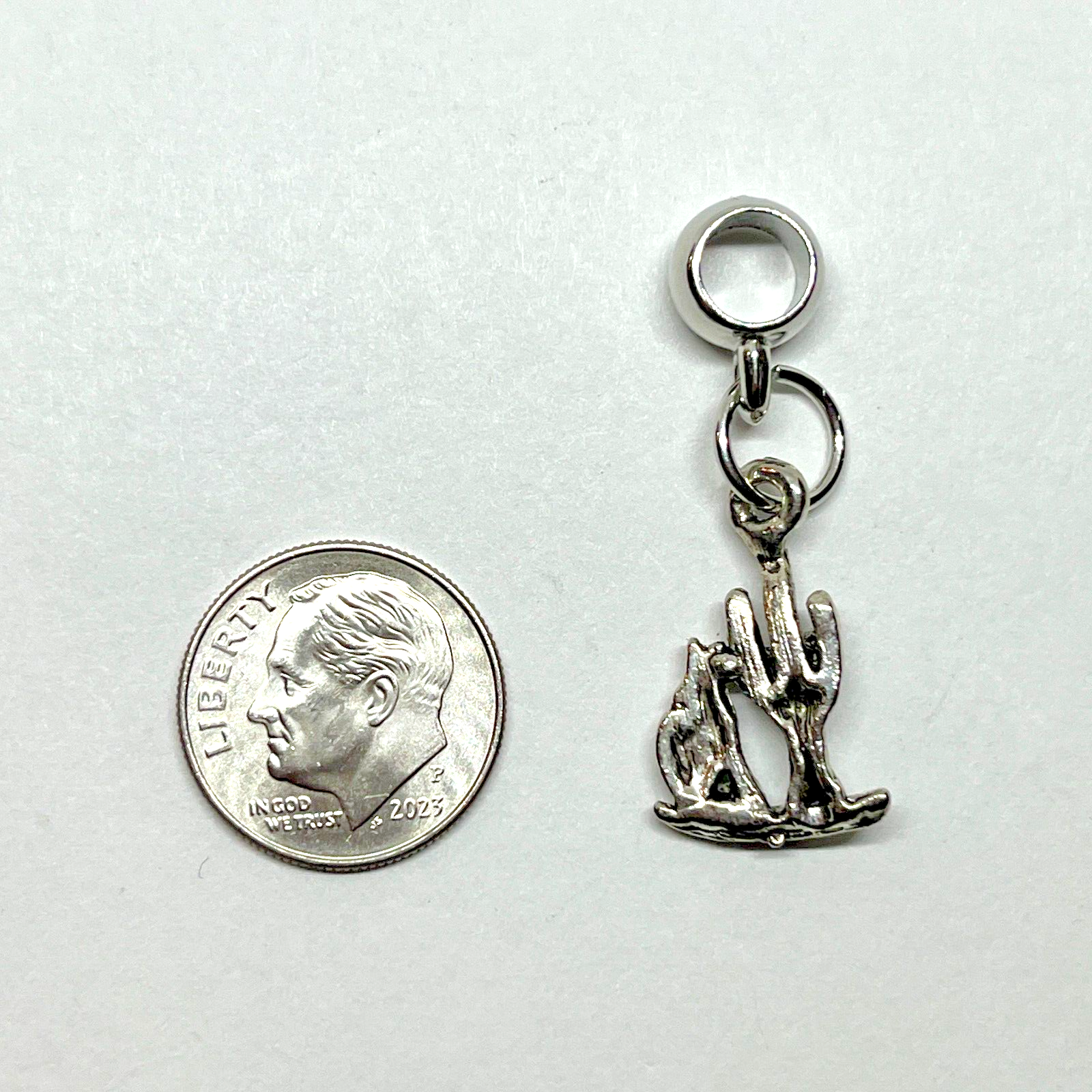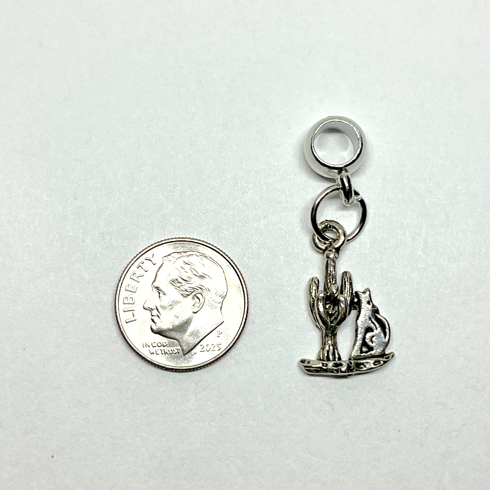 VINTAGE DESERT SCENE DANGLE CHARM Fits Pandora and European snake chain bracelets as well as thicker cords and necklace chains. CHARM DETAILS: Charm Metal: Silver Plated Finish Color: Silver Size: Compare photo with dime Style: Concave Available without bead attached upon request Snake bracelet not included SHIPPING: Shipping within the USA is free. Please refer to the estimated delivery date during checkout. Handling time is one business day.