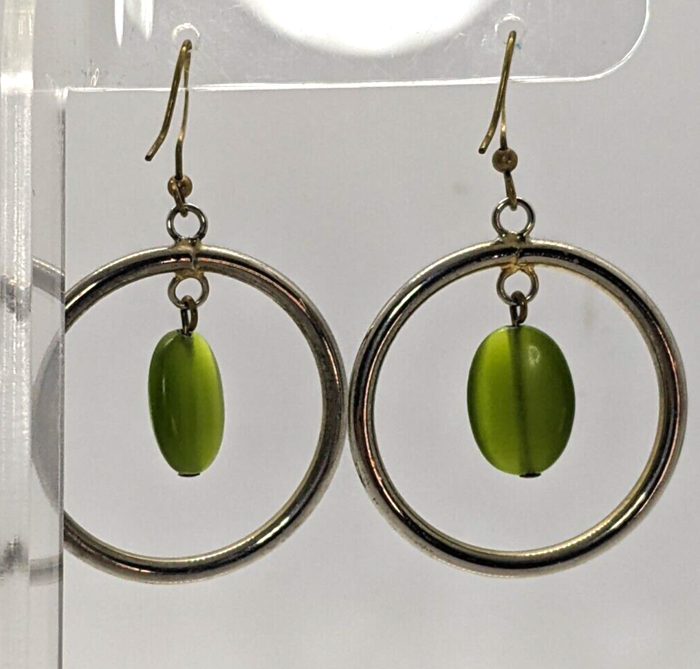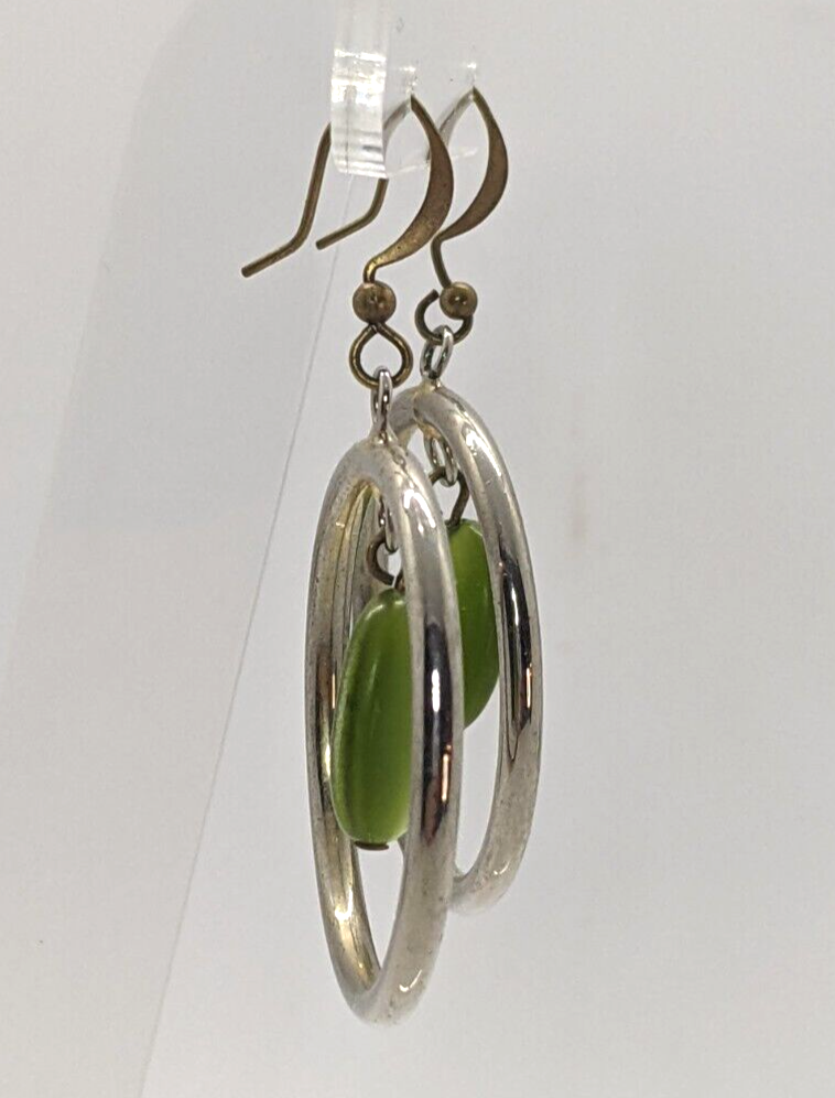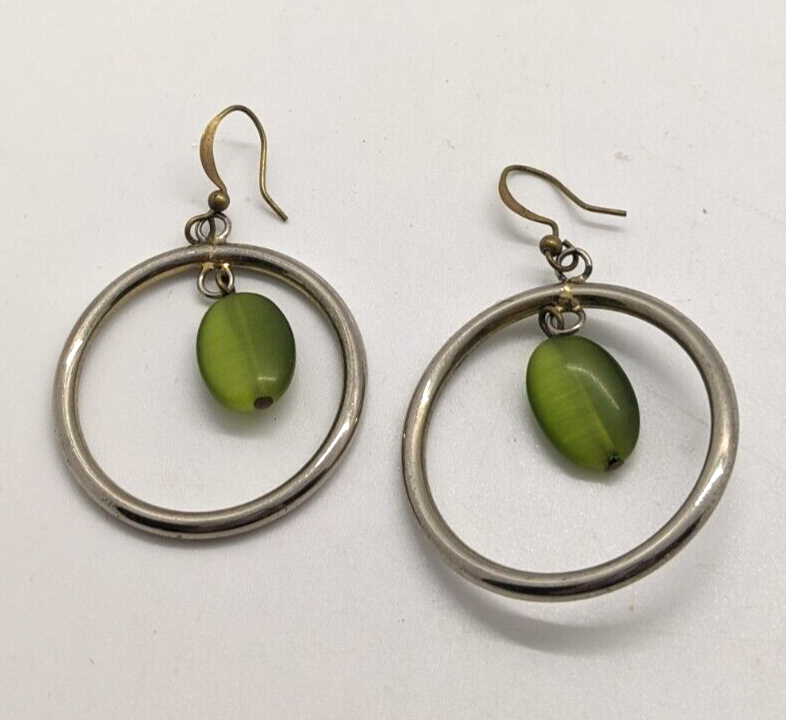 Dangling Hoop Earrings Silver Tone Faux Green Moonstone Bead Pierced 2" Drop 2" drop Hoop measures 1" in diameter Silver tone metal Green faux moonstone bead measures .5" x .25" Great condition Please message me with any questions and thanks for looking!