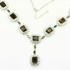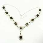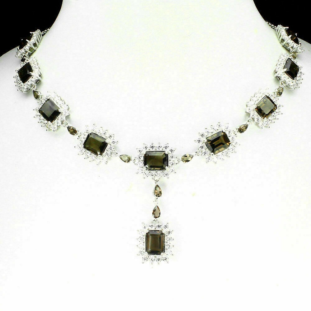 Solid sterling silver 925 stamped white gold coated drop necklace featuring octagon and pear cut faceted genuine natural mined chocolate brown smoky quartz gemstones each measuring from 5mm x 3mm to 9mm x 7mm set with 2.5mm x 2.5mm and 3.5mm x 3.5mm bright white round cut faceted lab created zircon stones. The necklace measures 40 to 45.7cm 16 to 18 inches using the extender and the stone set part measures 230mm x 47mm. GIFT BOXED Thanks for looking and please take time to view my other listings #12328 / 12379