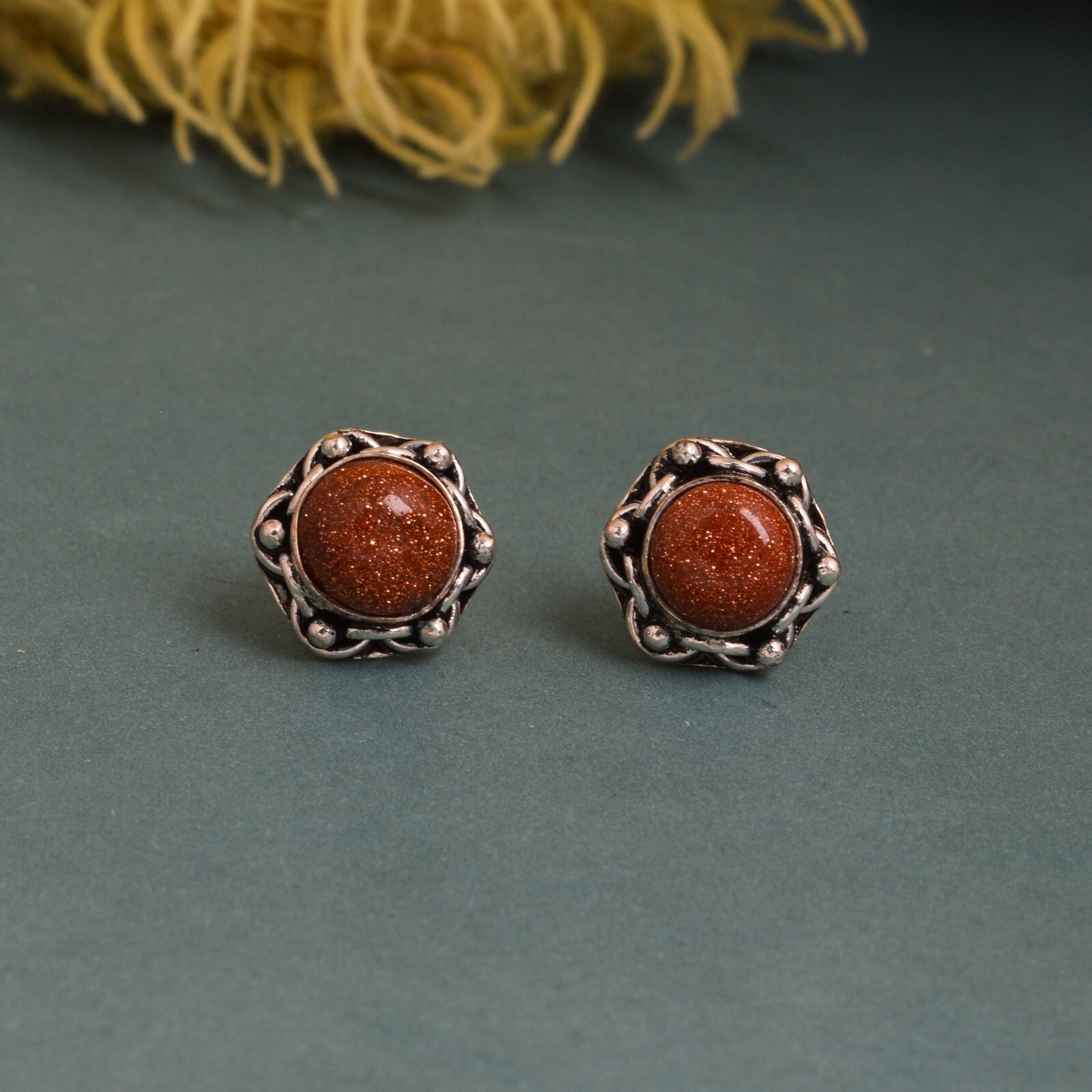 Add a touch of elegance to your outfit with these beautiful Sunstone Stud Earrings. The earrings are made of high-quality silver-plated brass with a round shape and a screw-back closure. The main stone is a natural Sunstone with clarity enhanced and a very good cut grade. The earrings are handmade and stackable, making them perfect for any occasion, whether it's an engagement, wedding, graduation, or birthday. The vintage-inspired design of these earrings with a touch of bohemian and punk theme makes them ideal for those who love nature, art, and vacation. The earrings are customized and come in a unit quantity of one. They are perfect for anyone who wants to add a touch of love and luck to their outfit. The earrings are made in India and are perfect for those who appreciate the beauty of natural stones. Shipping & Policies: Bringing Authentic Indian Silver Jewelry to Your Doorstep Welcome to our jewelry world, your gateway to authentic Indian jewelry straight from the heart of India. We are dedicated to offering you exquisite pieces crafted with precision and infused with the cultural richness of India, all at pocket-friendly prices. Shipping: We ship worldwide from India to bring the allure of Indian jewelry to your doorstep, no matter where you are. All orders are carefully packaged and shipped promptly to ensure your treasures arrive in pristine condition. We offer affordable shipping rates and strive to make your shopping experience hassle-free and enjoyable. Quality Assurance: At our shop, we prioritize quality and authenticity. Each piece in our collection is meticulously crafted by skilled artisans using german silver and traditional techniques. We stand behind the craftsmanship of our jewelry and guarantee its quality. Your satisfaction is our utmost priority. Customer Satisfaction: Your satisfaction is at the core of everything we do. We are committed to providing exceptional customer service and ensuring that your shopping experience exceeds your expectations. If you have any questions or concerns, please don't hesitate to contact us. Our dedicated team is here to assist you every step of the way. Shop with Confidence: Shop with confidence knowing that you are investing in authentic Indian silver jewelry that reflects the rich cultural heritage of India. Explore our collection and discover timeless pieces that resonate with your style and individuality. Thank you for choosing us for your jewelry needs. We look forward to serving you and helping you find the perfect pieces to adorn yourself or to gift to your loved ones. Happy shopping!