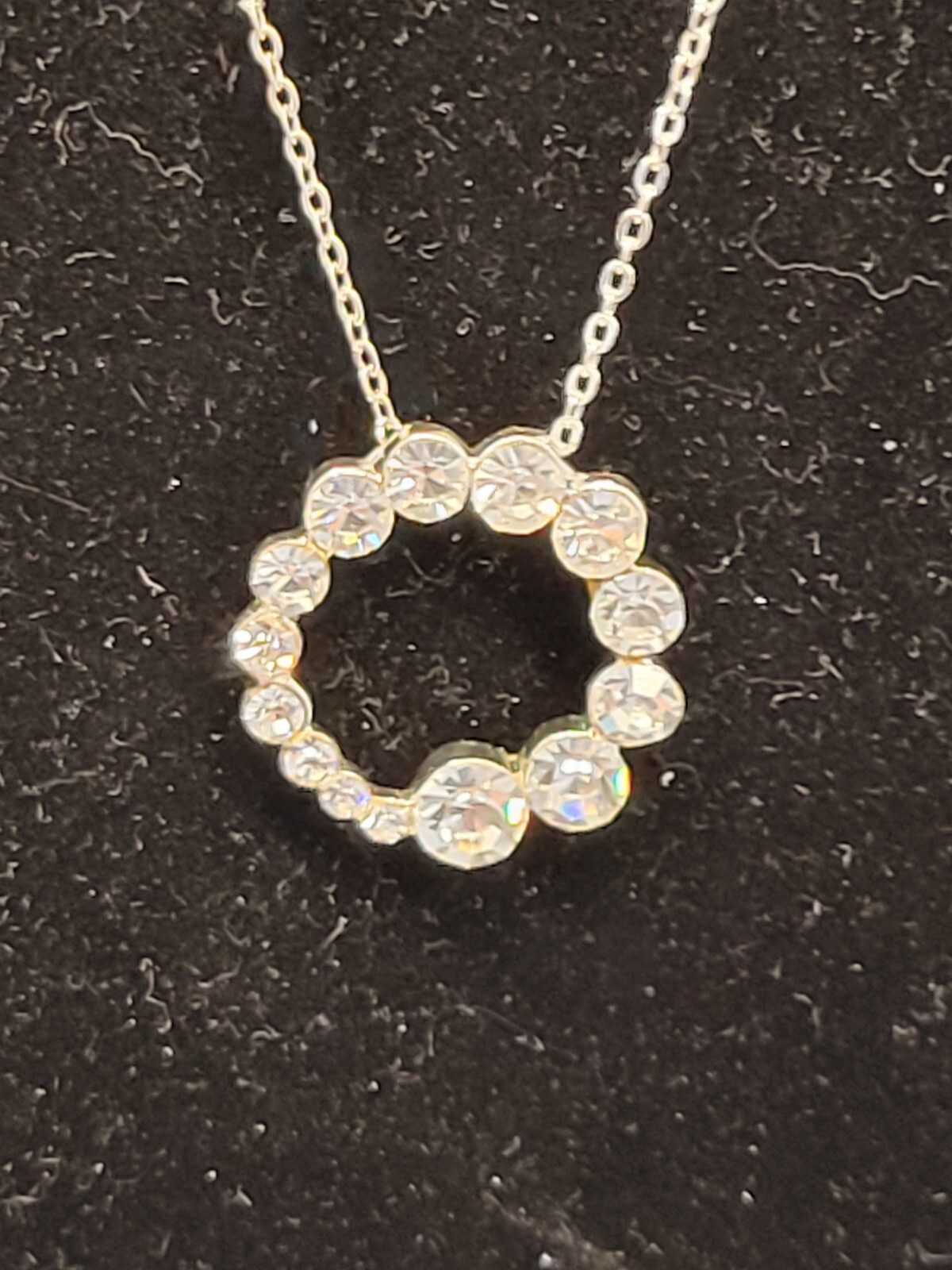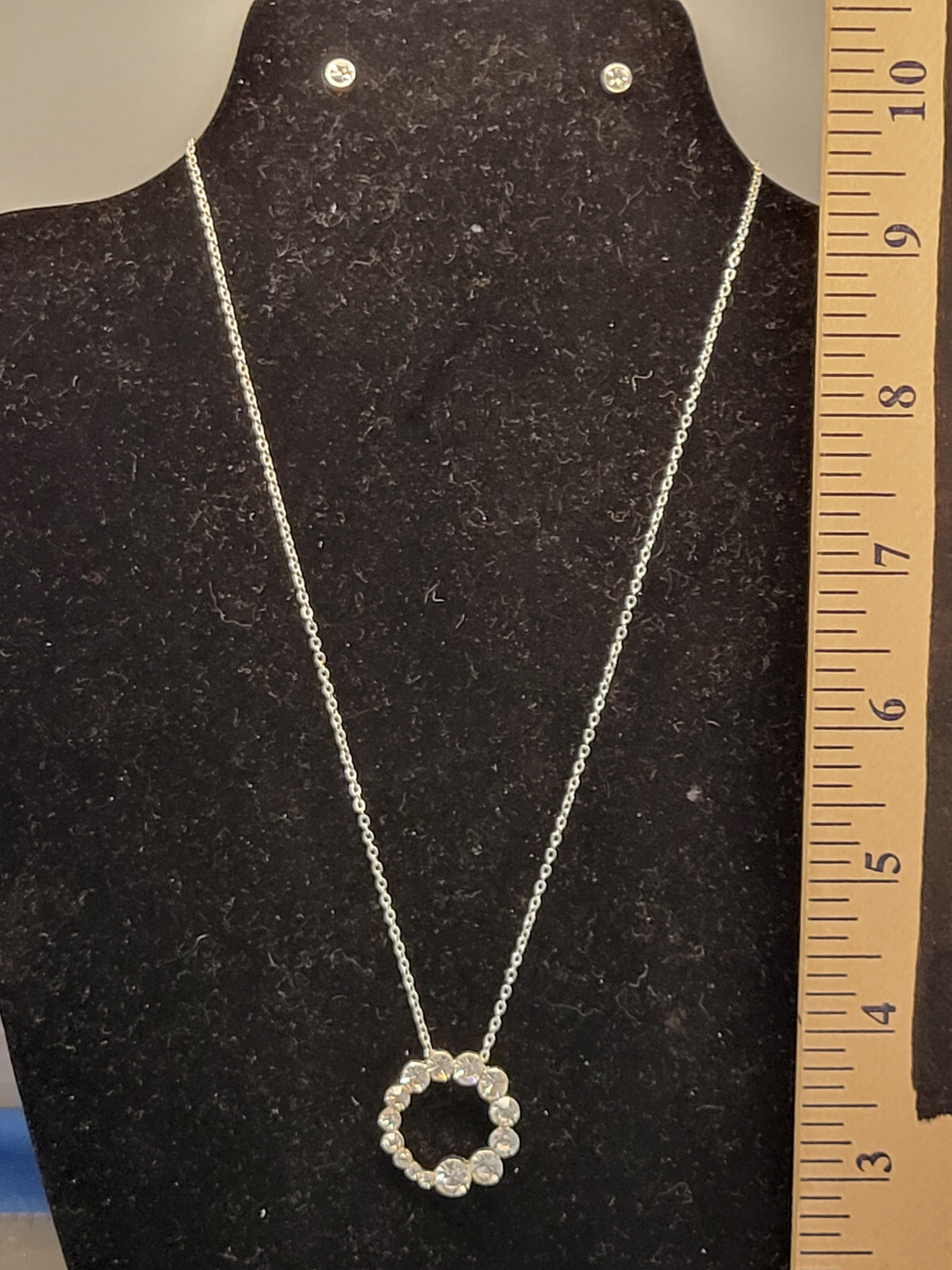 This is a Necklace and Stud Earring Set Silver and Rhinestone 14 Stones 18 inches This item is packaged with great care to prevent breakage.