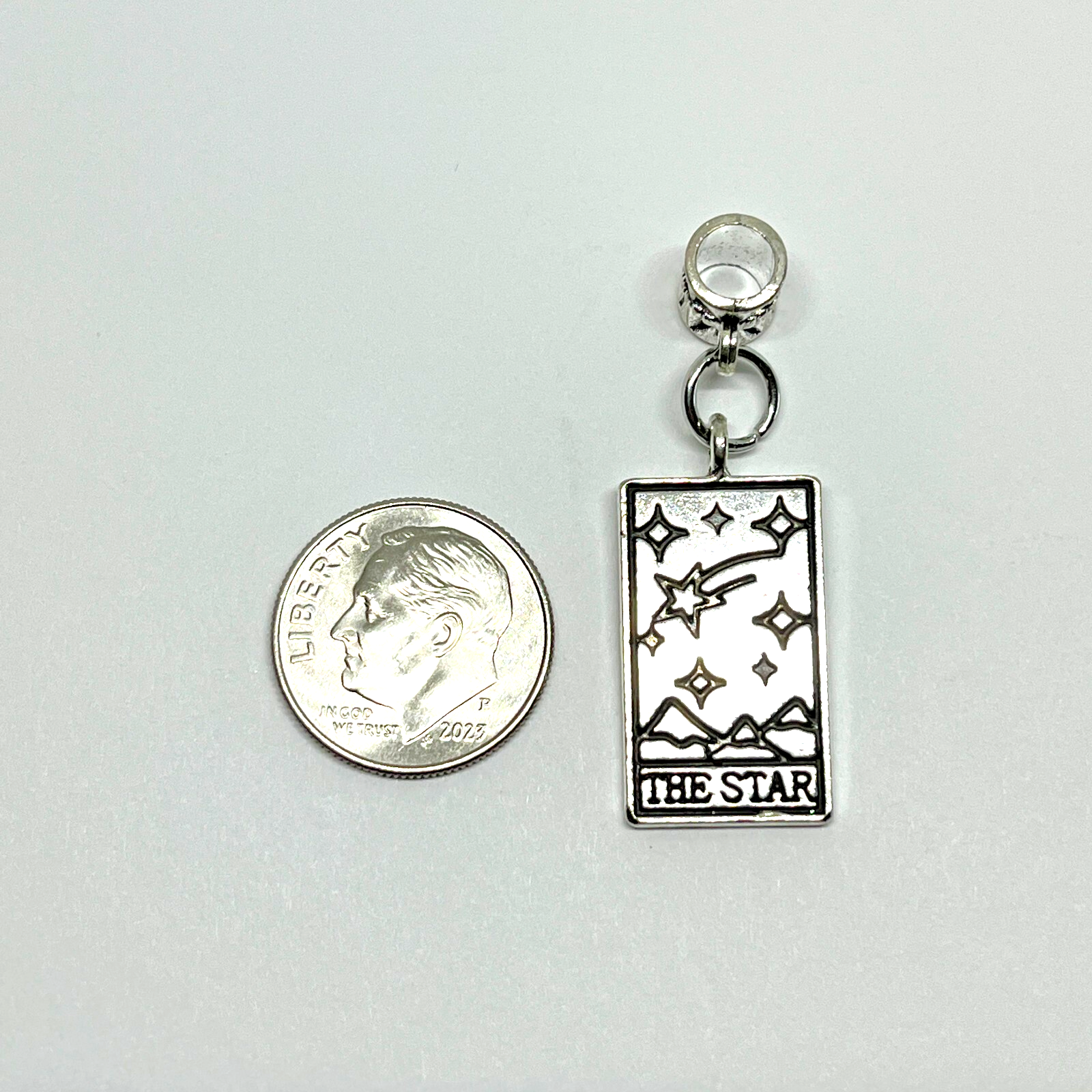 SILVER TAROT CARD CHARM Fits Pandora and European snake chain bracelets as well as thicker cords and necklace chains. CHARM DETAILS: Charm Metal: Silver Plated Finish Color: Silver Size: Compare photo with dime Style: Flat Available without bead attached upon request Snake bracelet not included SHIPPING: Shipping within the USA is free. Please refer to the estimated delivery date during checkout. Handling time is one business day.