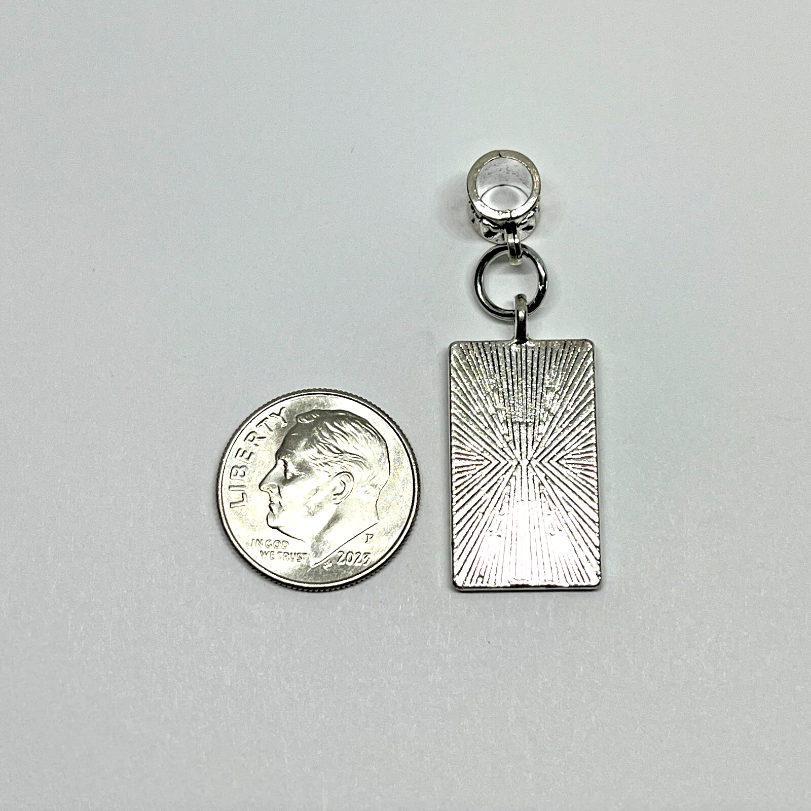 SILVER TAROT CARD CHARM Fits Pandora and European snake chain bracelets as well as thicker cords and necklace chains. CHARM DETAILS: Charm Metal: Silver Plated Finish Color: Silver Size: Compare photo with dime Style: Flat Available without bead attached upon request Snake bracelet not included SHIPPING: Shipping within the USA is free. Please refer to the estimated delivery date during checkout. Handling time is one business day.