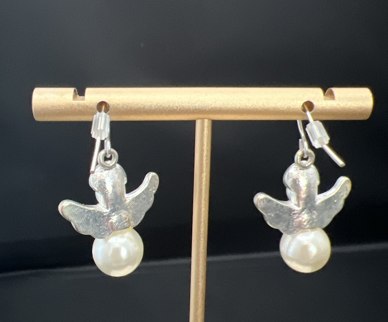 EARRINGS Dangling Angel Silver Tone Wings & Halo White Faux Pearl Body 1.5 Inches In Good Pre Owned Condition See Photos (5310)