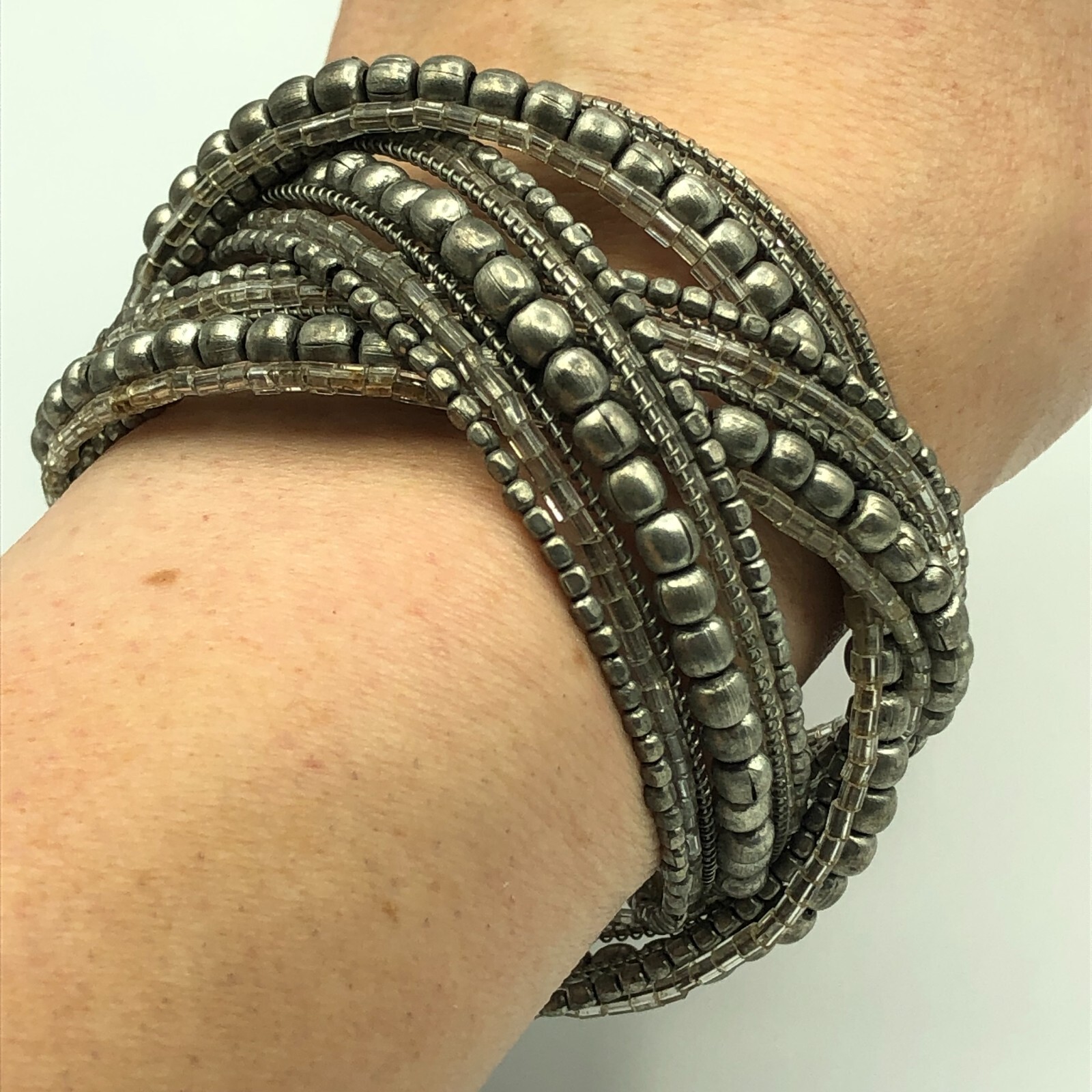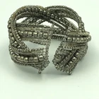 This is a secondhand cuff bangle. The bangle is made from silver tone woven strands of beads. This is used in good condition with some minor signs of wear/scratches/tarnish. This is approximately 5.8 cm internal diameter.