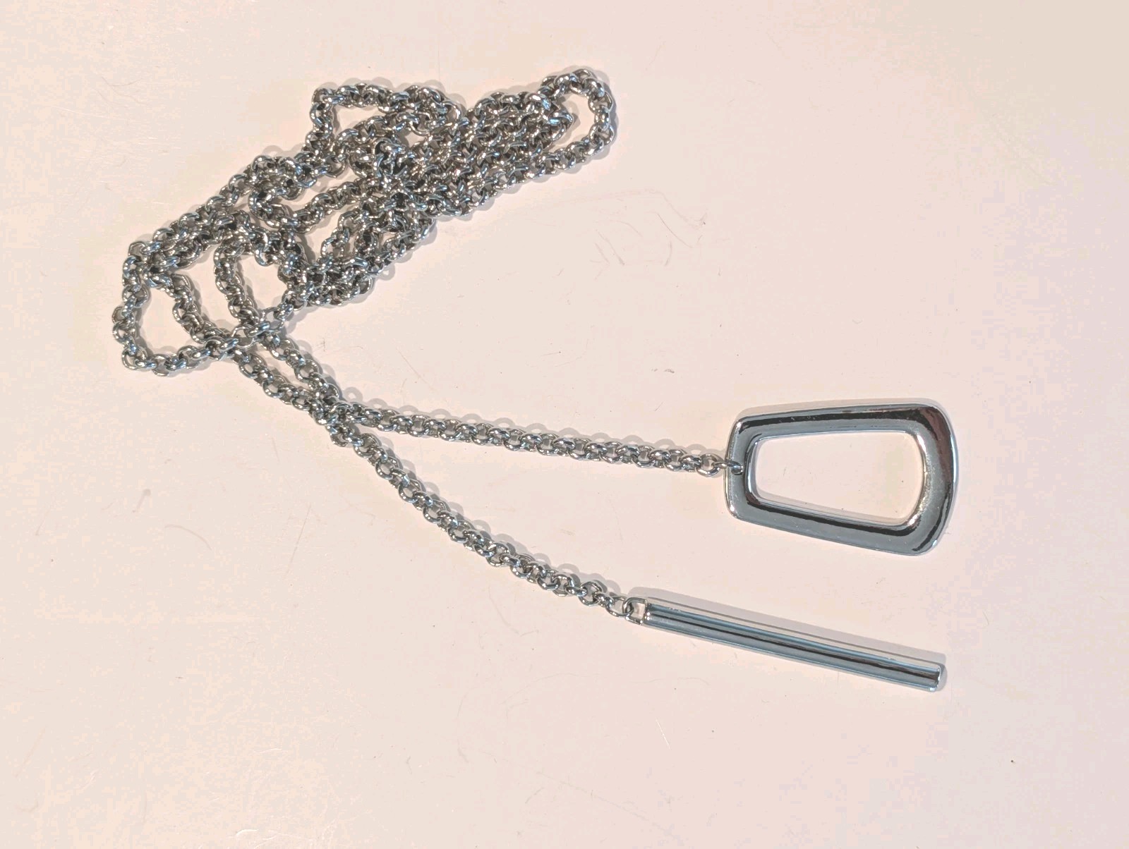 The product is a stylish silver tone adjustable lariat necklace with a geometric bar pendant. It features a cable chain closure and is made of metal, adding a touch of sophistication to any outfit. The minimalist design and lack of secondary stones make it versatile and easy to pair with a variety of looks, making it a versatile addition to any jewelry collection. Approximately 26" long.