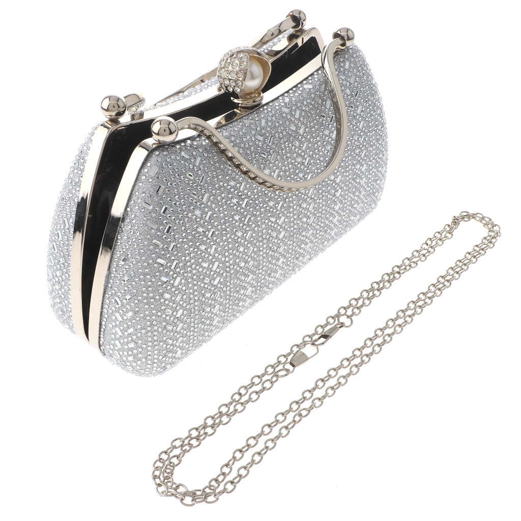 Silver Tone Metal Frame Crystal Rhinestone Fashion Clutch Evening Bag / Satin Fabric / Metal Handle with Pearl / Both Sides Rhinestone / Long Chain Strap / Approximate Size: 8.5"L x 4.75"H x 3.25"W / Color: Silver Condition: Brand New SKU: TLX218-SIL Color: Silver Design: All orders will ship from USA via UPS or USPS. We expect all local orders will receive the items within 7 business days or less depend the location. Worry free international shipment delay or custom duty fee.