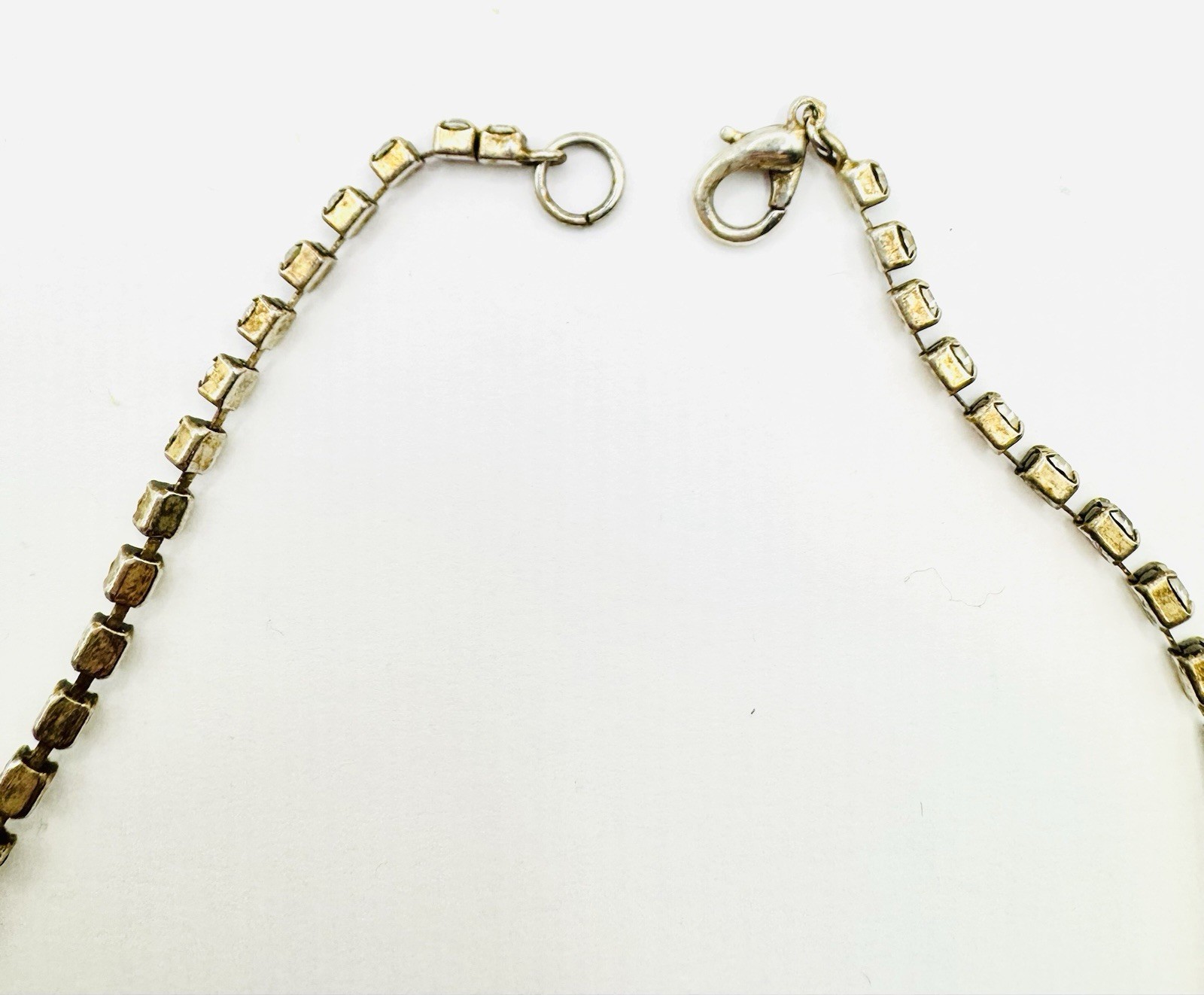 Modern Necklace with Clear Rhinestones that are Prong Set Stone. Silver Tone. “V” Shape In Front. Measures 16” but V hangs lower. Great condition showing no wear. Brilliant stones. Made well. Combined shipping available with multiple purchases. Mailed USPS Ground Advantage. (C-486)