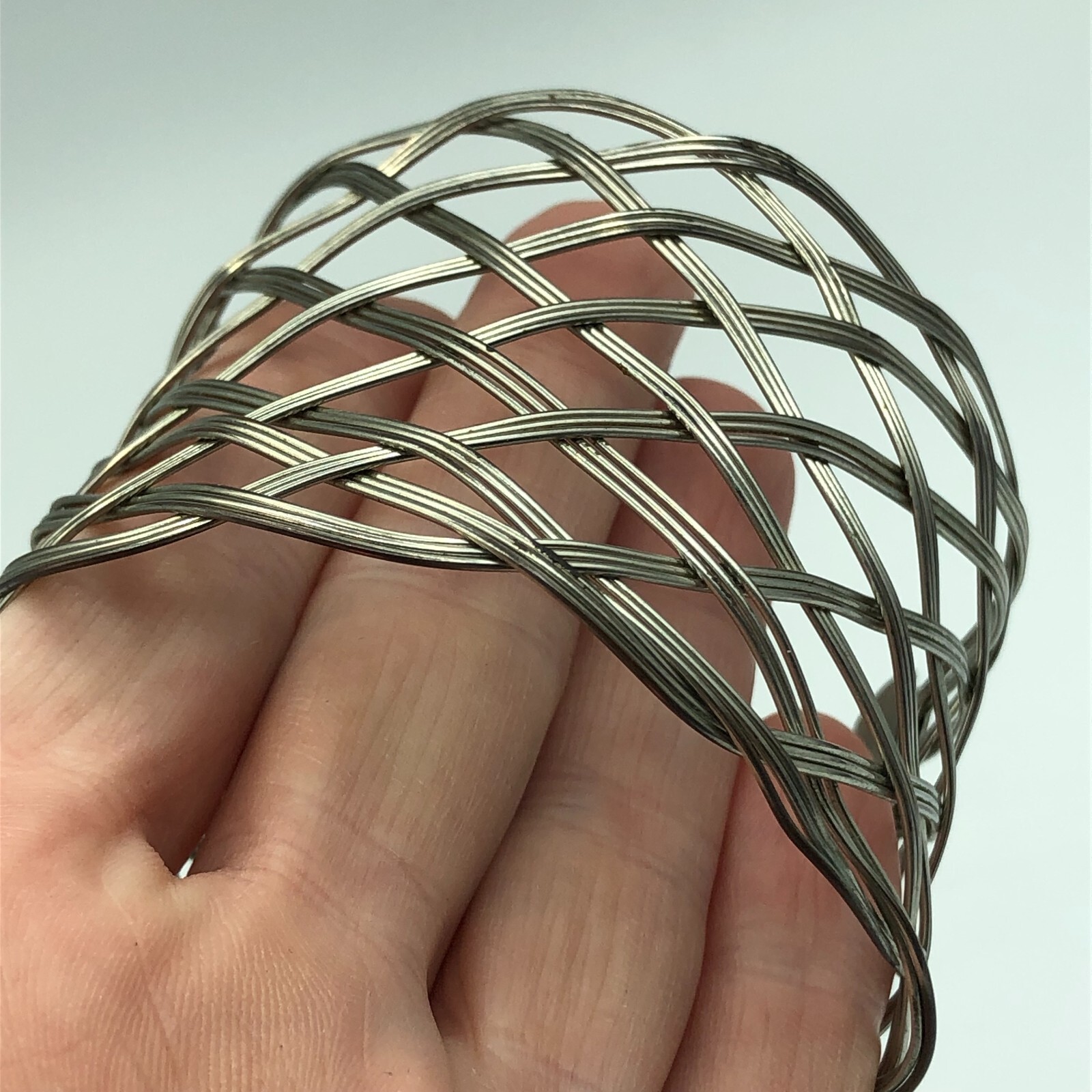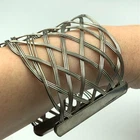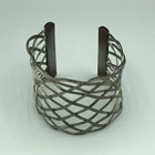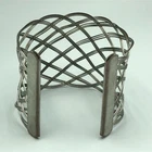 This is a secondhand cuff bangle. The bangle is made from silver tone metal and is a cuff wrap-around with a woven design This is used in good condition with some minor signs of wear/scratches/tarnish. This is approximately 6.2 cm internal diameter.