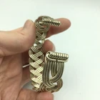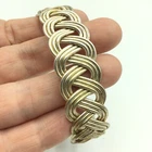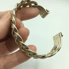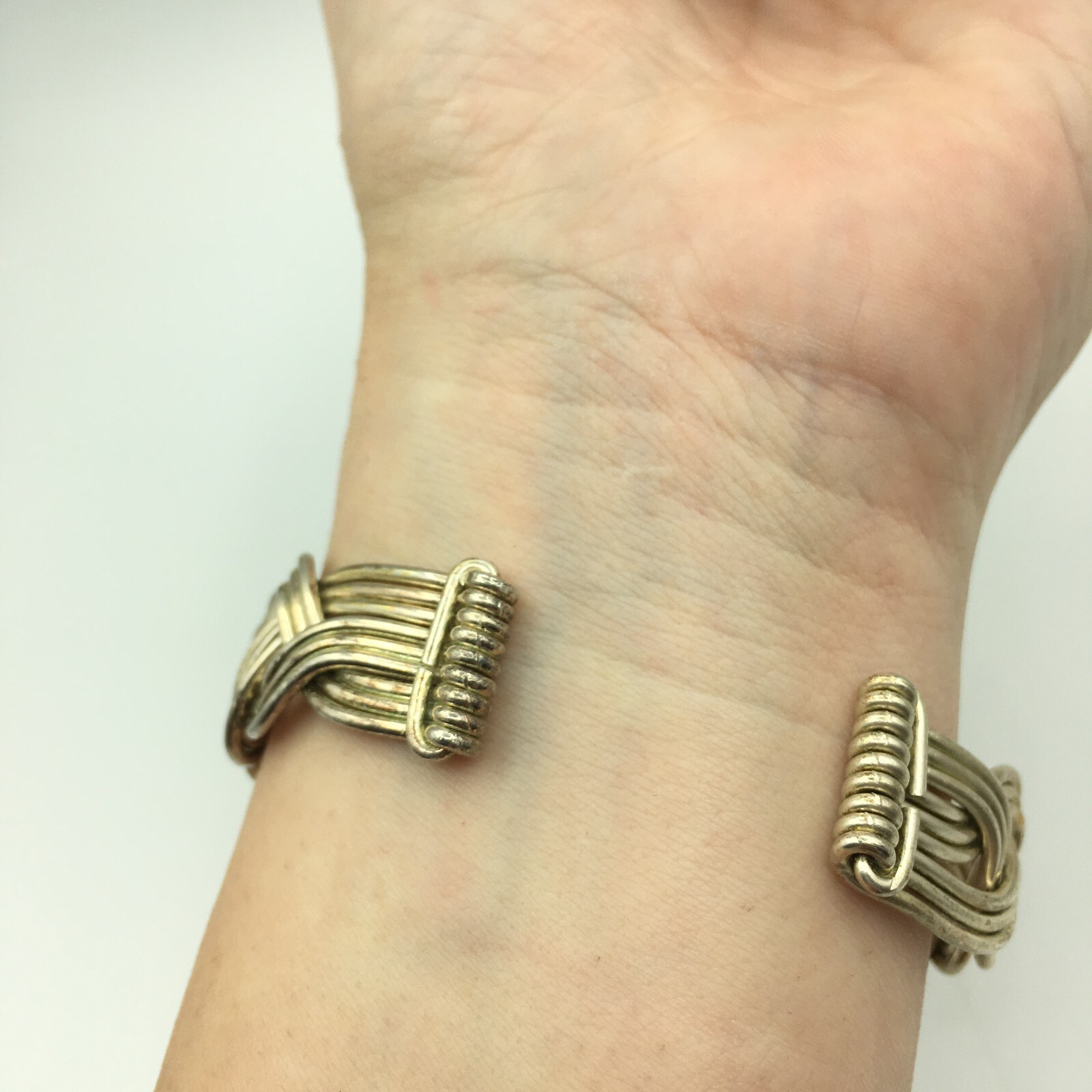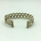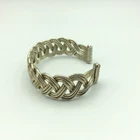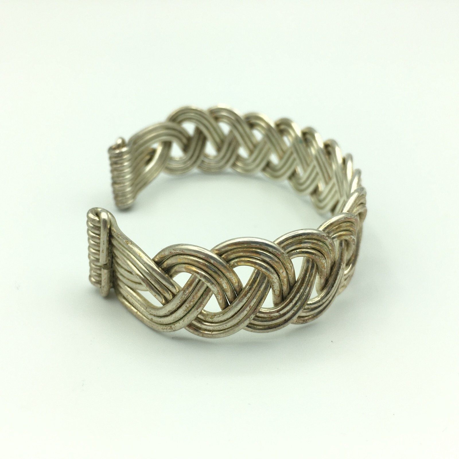 This is a secondhand cuff bangle. The bangle is made from silver tone metal and is a cuff wrap-around with a woven Viking-style or Celtic-style design on the front face This is used in good condition with some minor signs of wear/scratches/tarnish. This is an adult size at approximately 6.3 cm internal diameter.