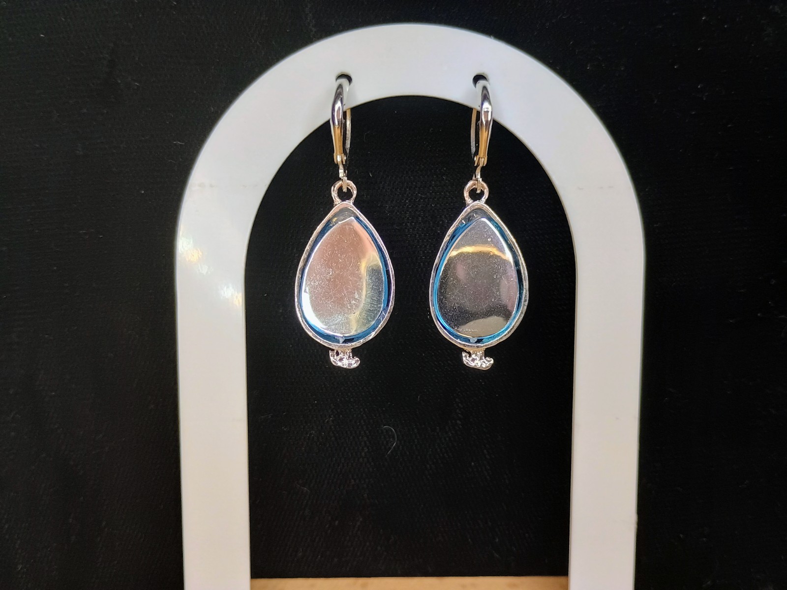 The product is a pair of silver tint teardrop earrings featuring a black and white cat design with blue accents. The earrings are dangle/drop style and do not have a main stone, making them a unique and eye-catching accessory. The teardrop shape and silver metal add a touch of elegance to the overall design, making them a fashionable and stylish addition to any outfit.