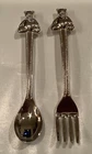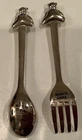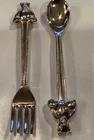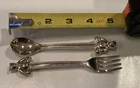 This adorable child's spoon and fork set features a charming Teddy Bear design, perfect for your little one's mealtime. The silverplate construction adds a touch of elegance to this practical item, which is suitable for both boys and girls. Nice weight to this set, well made. Crafted in China, this set is brand new and ready to be added to your baby keepsake collection. Whether you're looking for a unique gift for a baby shower or simply want to add some personality to your child's dinnerware, this silver Teddy Bear spoon and fork set is a great choice. Never used with original stickers on each. See photos as part of description.