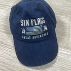 Six Flags Great Adventure Baseball Cap Color: Navy Blue Design: • Embroidered “SIX FLAGS” text with the year 1974 • American flag patch in the center • “GREAT ADVENTURE” embroidered below the flag • Velcro adjustable strap on the back Condition: Pre-owned and in good condition. Some light lint/fuzz present (can be cleaned). No rips or stains. Size: One size fits most (adjustable strap)