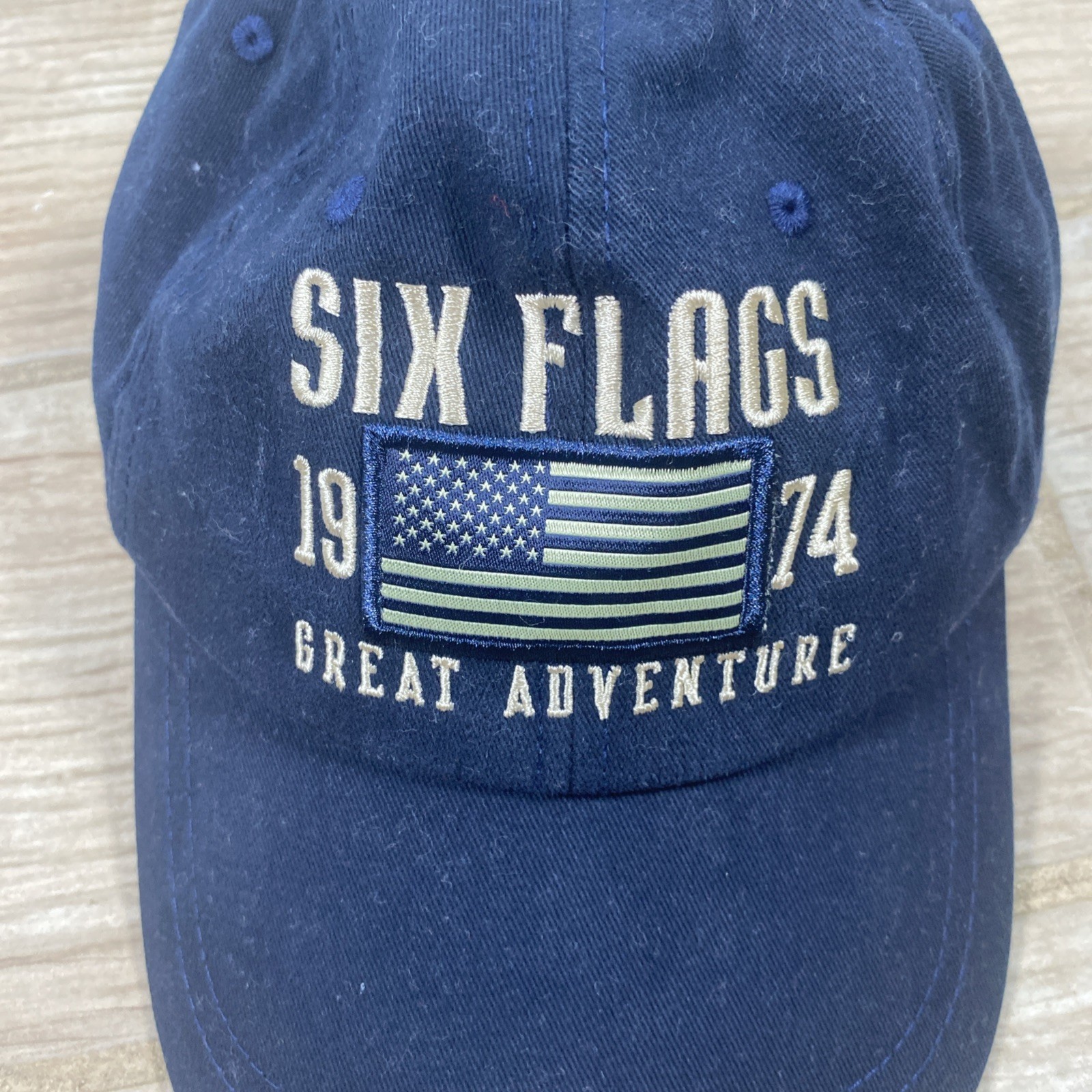 Just got this awesome vintage cap! The embroidery is crisp, it fits perfectly with the adjustable strap, and the patriotic flag design looks fantastic. Light fuzz wipes right off - such a cool piece of Six Flags history!
