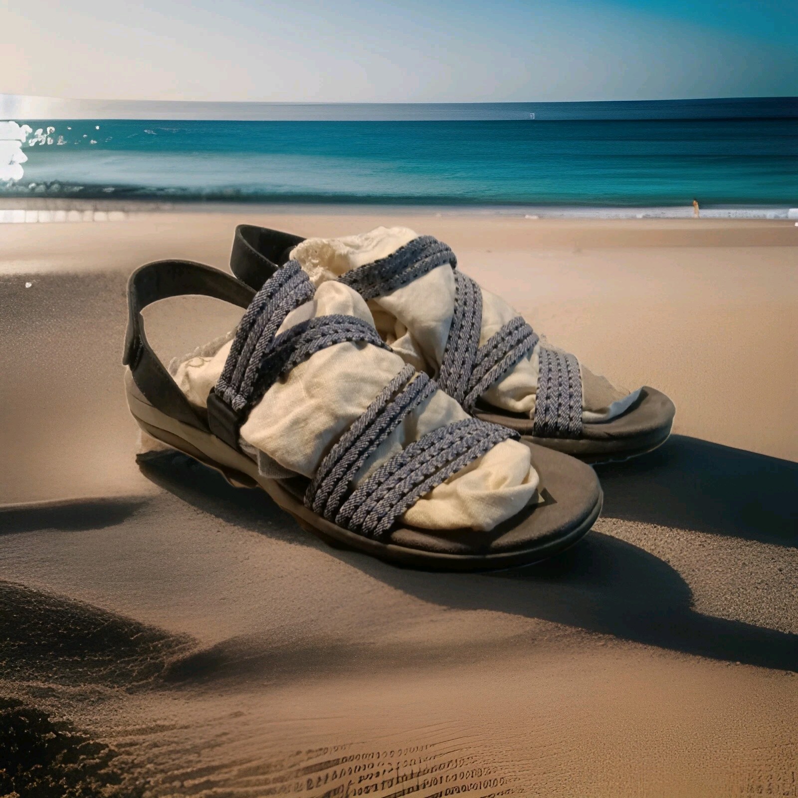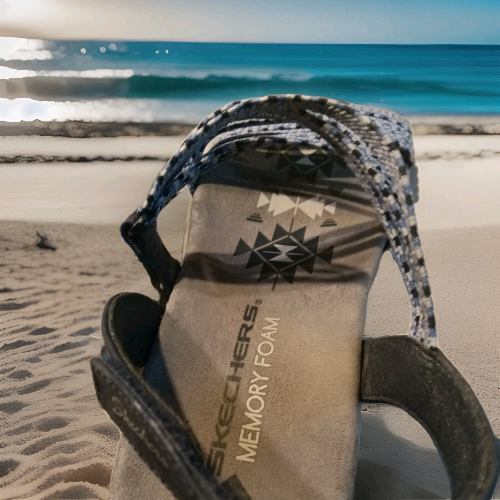 Skechers Reggae sandals offer a perfect blend of comfort and style for the modern woman on the go. With their strappy design and a vibrant blue hue, these sandals provide a classic look that's versatile for casual wear, travel, or any activewear occasion. The sandals feature a convenient hook and loop closure ensuring a secure fit for a US size 10 foot, and the low wedge heel offers a subtle lift without sacrificing comfort. Crafted with an upper and lining made of durable synthetic materials, these sandals promise both breathability and longevity. The cushioned insole and rubber outsole provide all-day support and traction, making them an ideal choice for those who value both form and function in their footwear. The timeless design, complemented by the Skechers logo accent, makes these sandals a must-have for any wardrobe.
