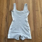 The Skims Medium Gray Cotton Blend Ribbed one piece Romper Sleepwear is a stylish and comfortable bodysuit designed for women. Made from a lightweight and breathable cotton blend material, this romper features a slimming fit with stretch for ease of movement. The mesh lining adds a touch of sophistication, while the gray color makes it versatile for any wardrobe. Perfect for lounging or sleeping, this bodysuit combines fashion and function for a chic look.