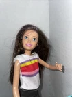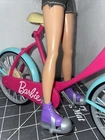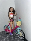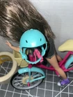This Skipper Doll Barbie Sister Brunette Hair Purple Streaks 2010 Body 2016 Head is a must-have for any Barbie collector. This 10.5-inch fashion doll features straight brunette hair with purple streaks, blue eyes, and an articulated body. She comes with her outfit and a necklace, making her ready for any occasion. This Barbie doll is an original, licensed reproduction from Mattel and was manufactured in Indonesia. She is a part of the Barbie franchise and is perfect for teens and adults. This doll does not come with packaging and is not antique or vintage. Personalize her to make her unique. I have included a blue and pink bicycle along with a helmet.